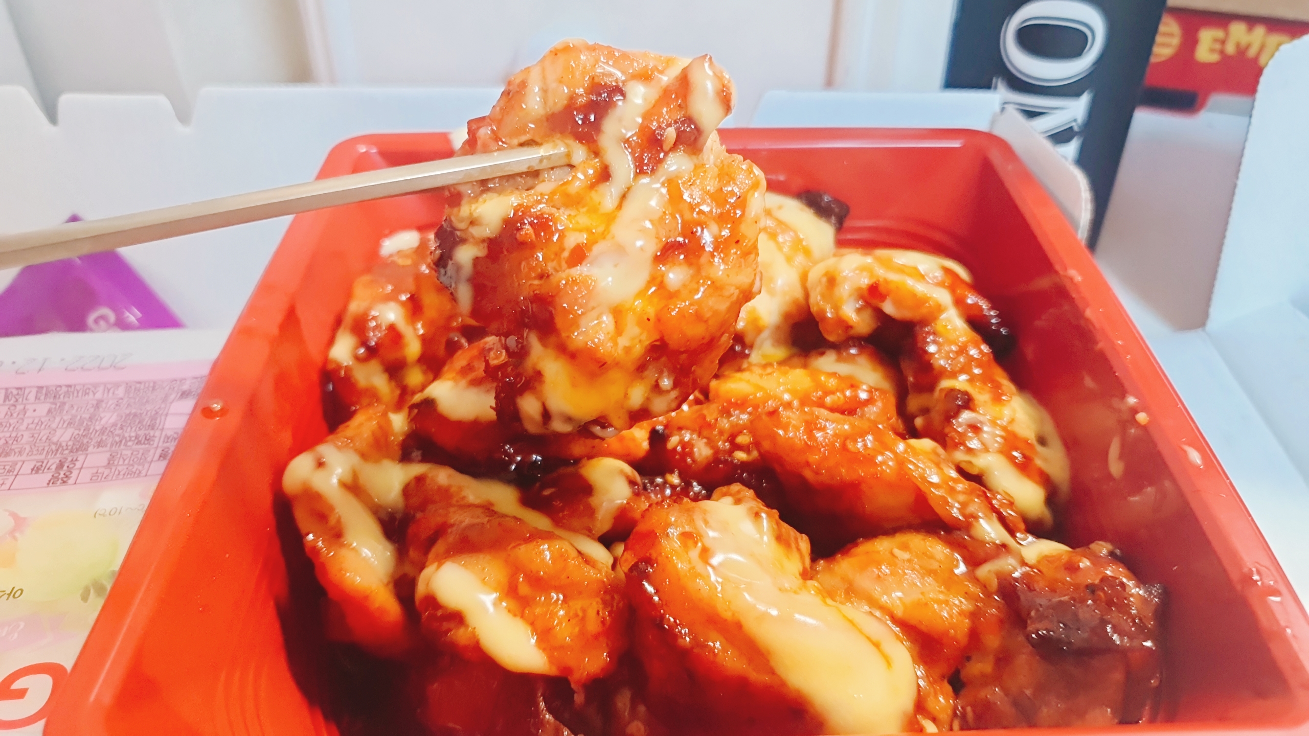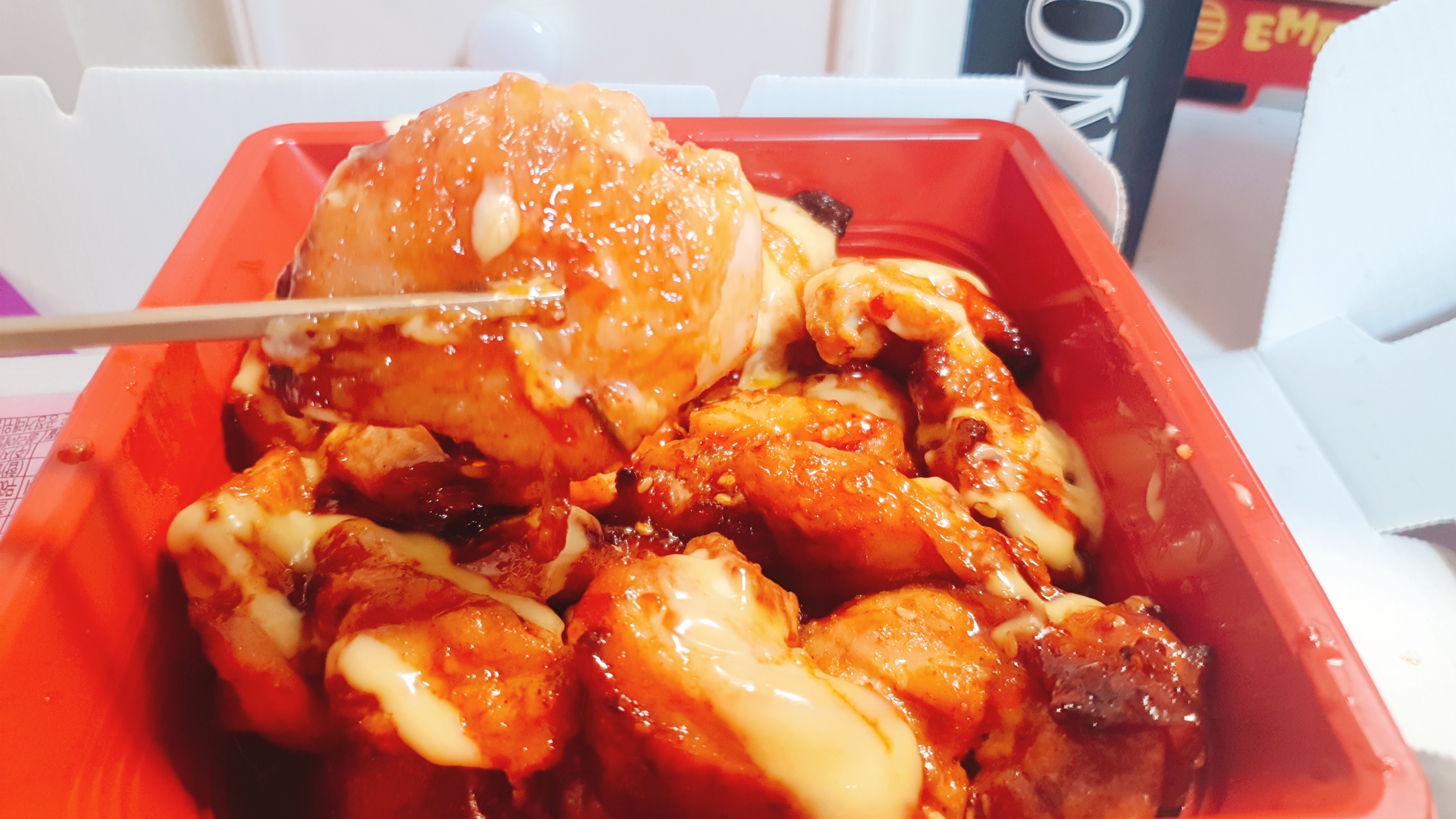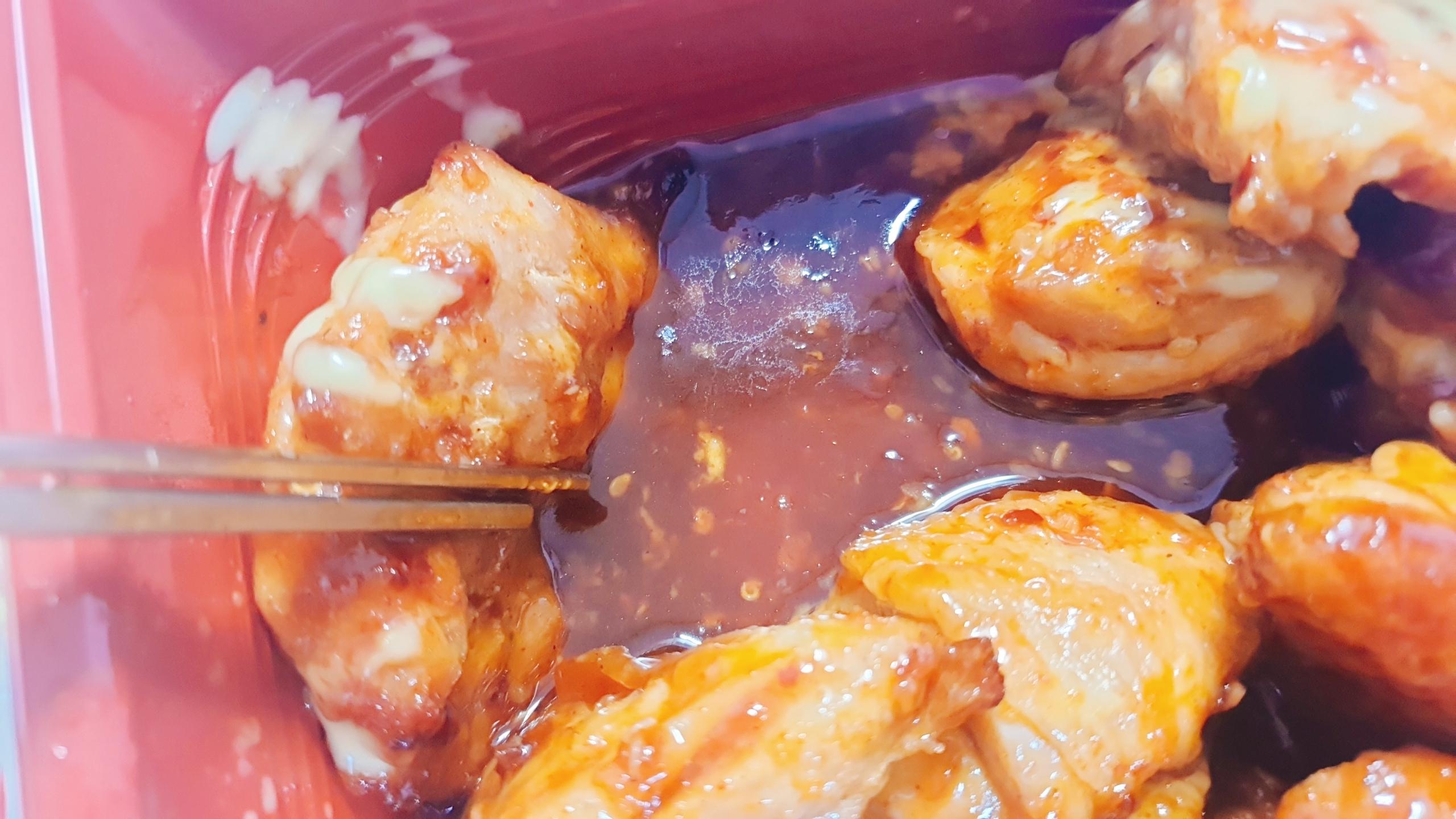 짠~!! 하... 진심 비주얼 장난아니것 아닌가요??!! 갈비천왕 치킨 느낌에 매콤한 소스가 올려져서 위에 뿌려진건