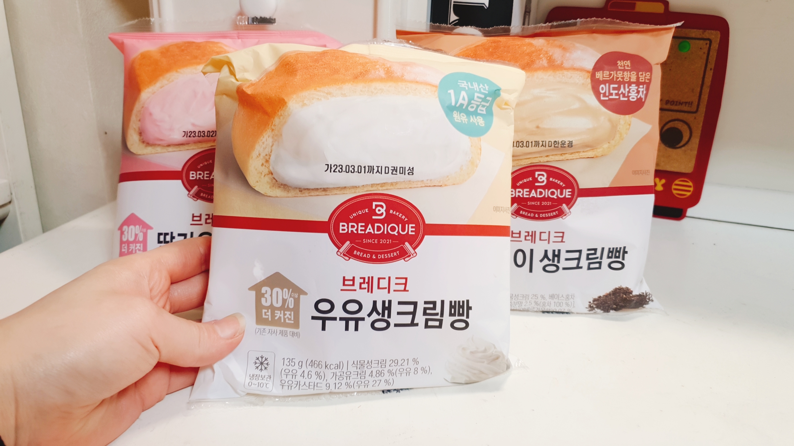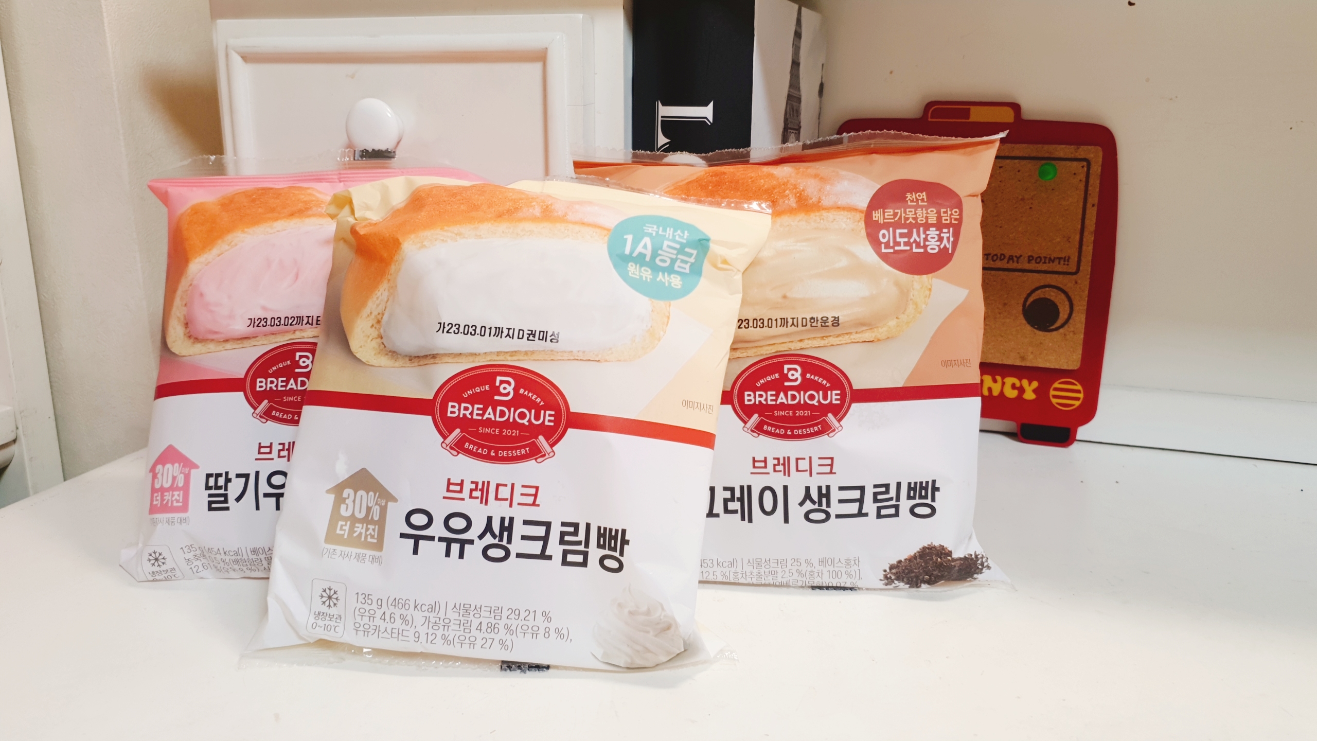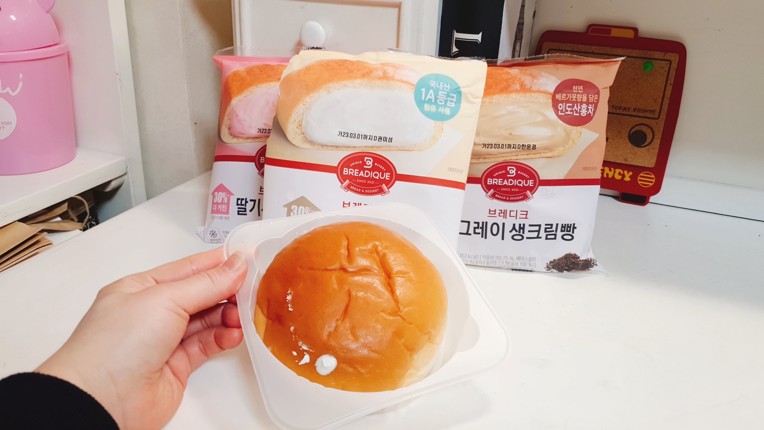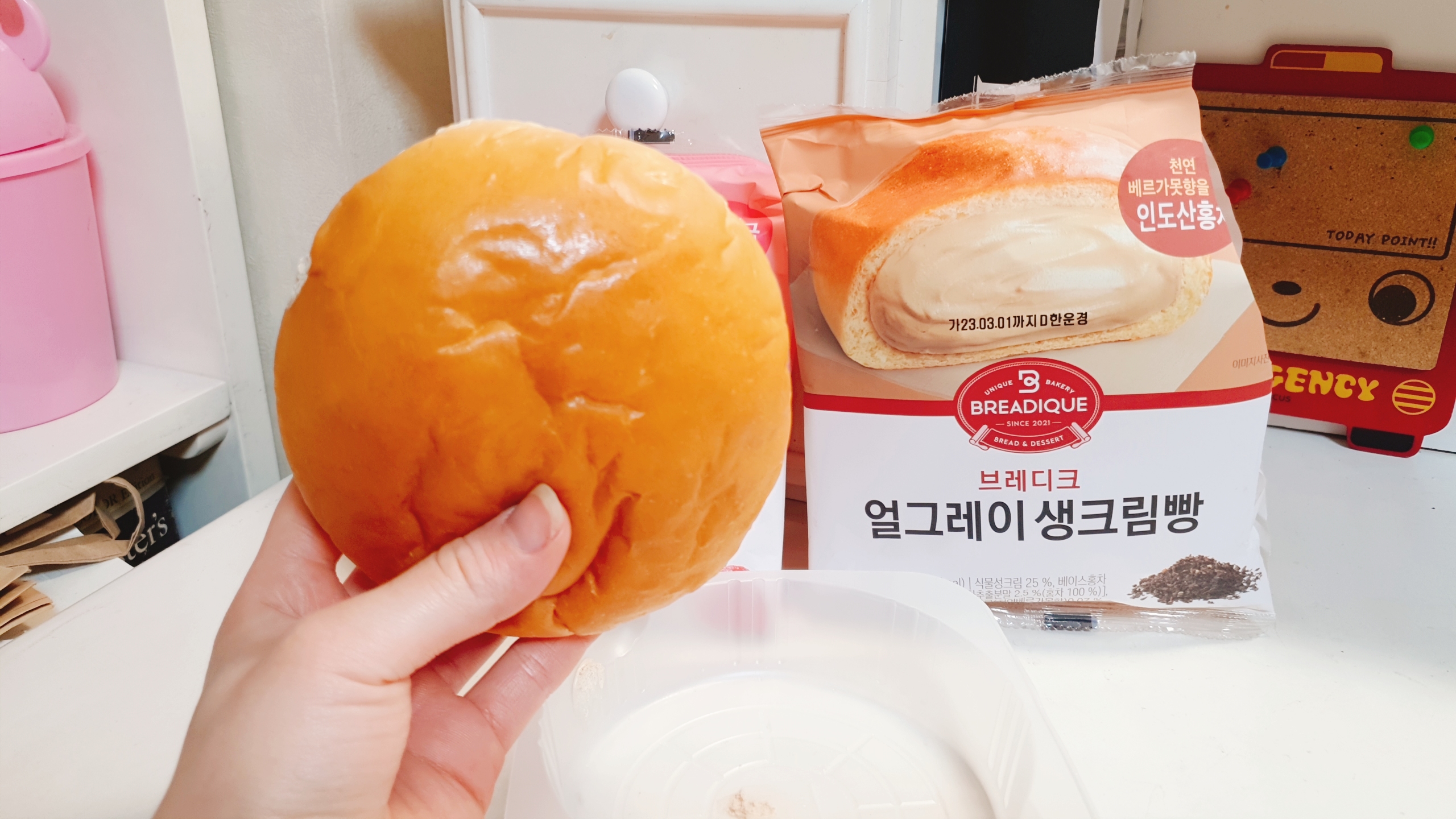 딸기우유생크림빵 리뷰: 음.. 그냥 서울우유 딸기우유 맛.. 딸기 엄청 좋아하지도 싫어하지도 않아서 그냥 그랬어욥 좋아하는 사람은 나쁘지 않게 먹을 것 같은 느낌..? 그래도 되게 맛있었으면 설향딸기몽쉘처럼 극찬했을텐데 나쁘지않은 평범한 맛이었습니다~ 먹어본 걸로 만족~! 그래도 얼그레이 만큼은 아녔어요ㅋㅋㅋㅋ