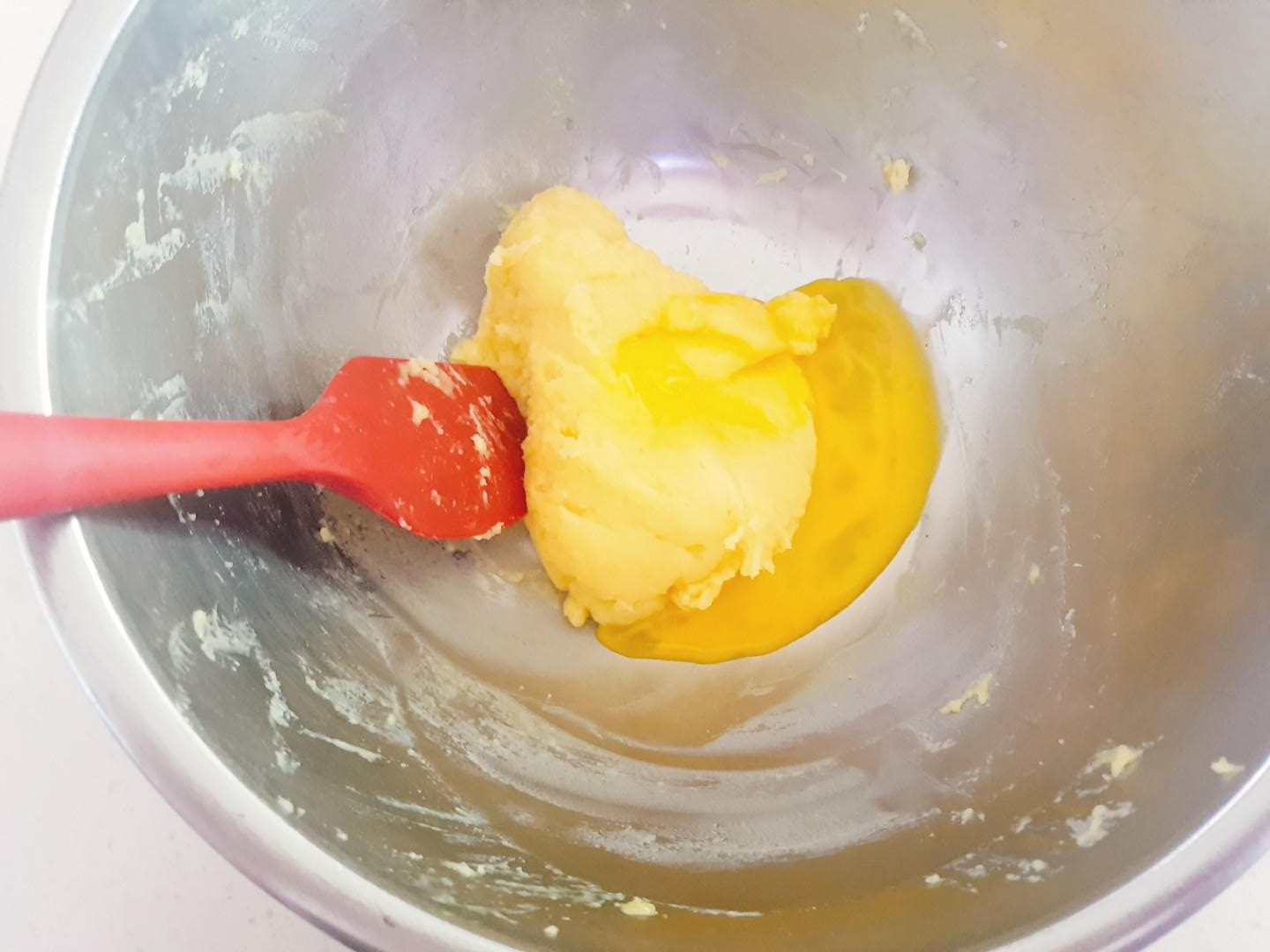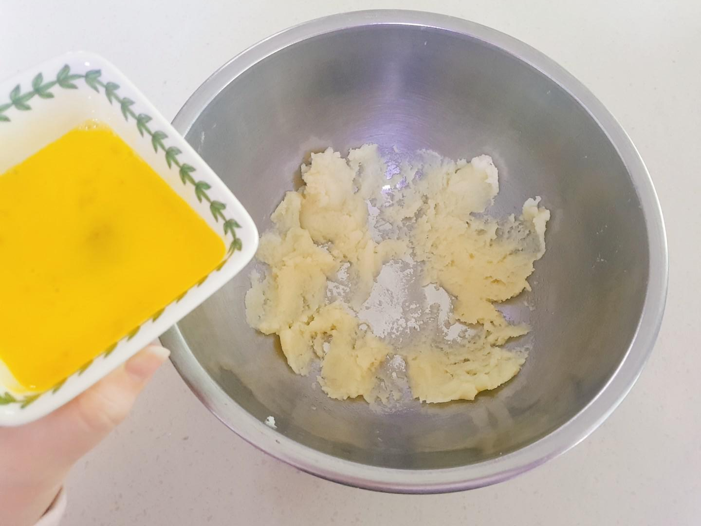 계란이랑 반죽이 잘 안뭉쳐지긴 한데 계속 섞다보면 반죽에 계란이 흡수되더라구요 계란을 추가하기전 반죽이 완전히 균일한 상태가 될 때까지 잘 섞여 있어야 해요~ 휘핑기를 사용해도 되요~