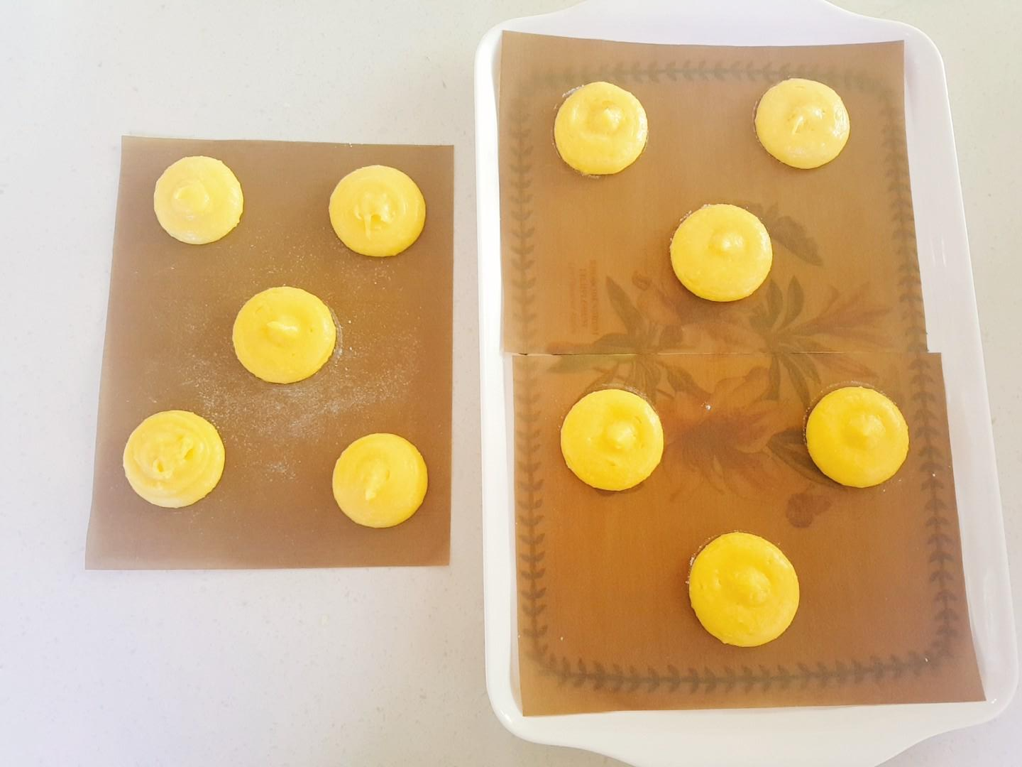 6. 짤주머니에 반죽을 담아 5cm정도로 파이핑해 주고 얼려둔 비스킷을 올린 후 200℃에서 20분 예열한 오븐에서 15분 구운후, 180℃에서 10-15분 구워주세요