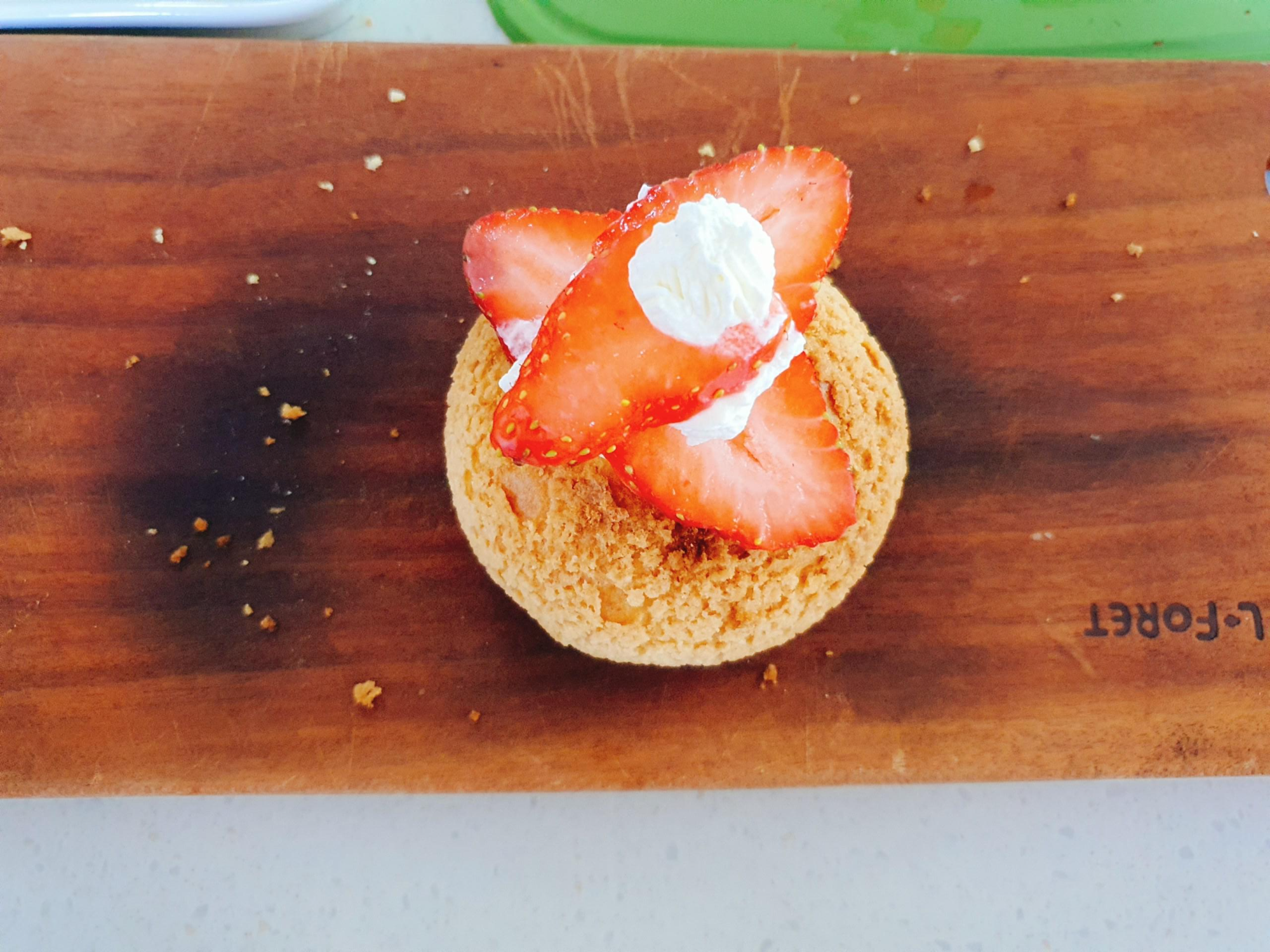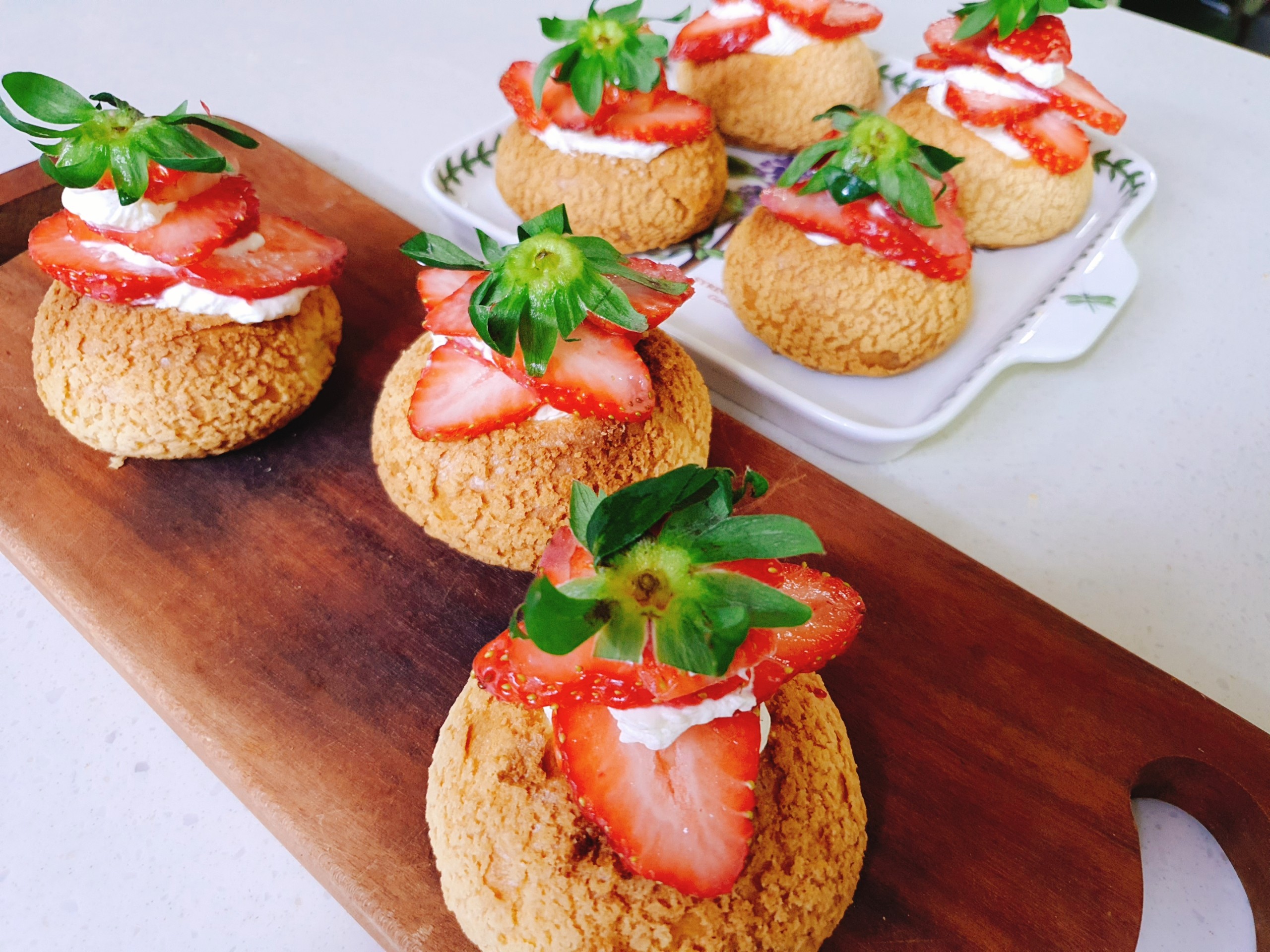 8.이제 슈 윗부분을 잘라 짤주머니에 담은 필링을 넣어주고, 위에 딸기를 올려 장식해주면 됩니다~!!