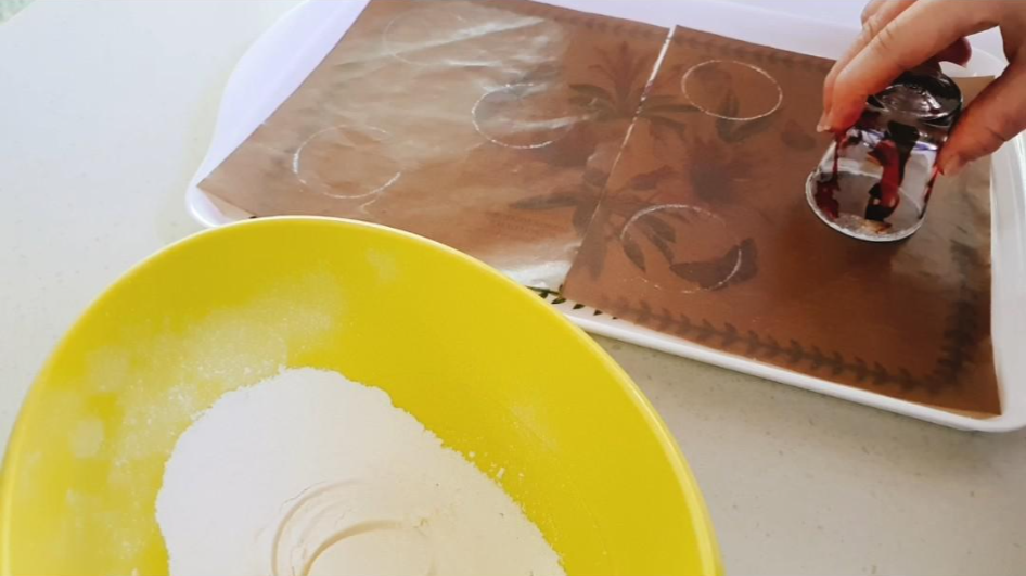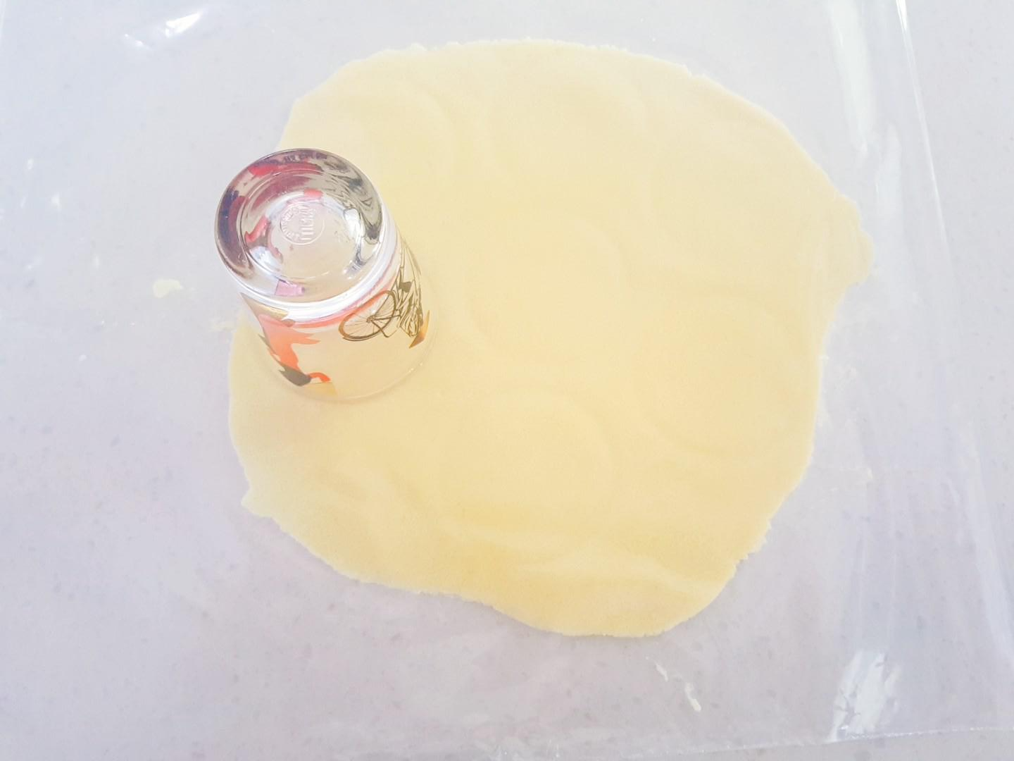 지름이 5cm 원형커터가 있으시면 원형커터로 하시면 되는데 베이킹 초보분들은(저는) 그런 사치스러운 도구는 없기 때문에 5cm 정도 되는 소주잔을 이용해 줍니다~ㅎㅎㅎ (잘 찍히더라구욯)