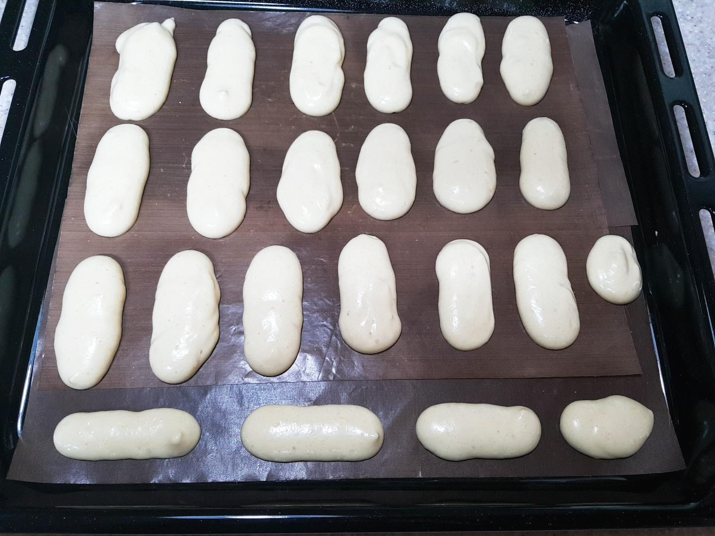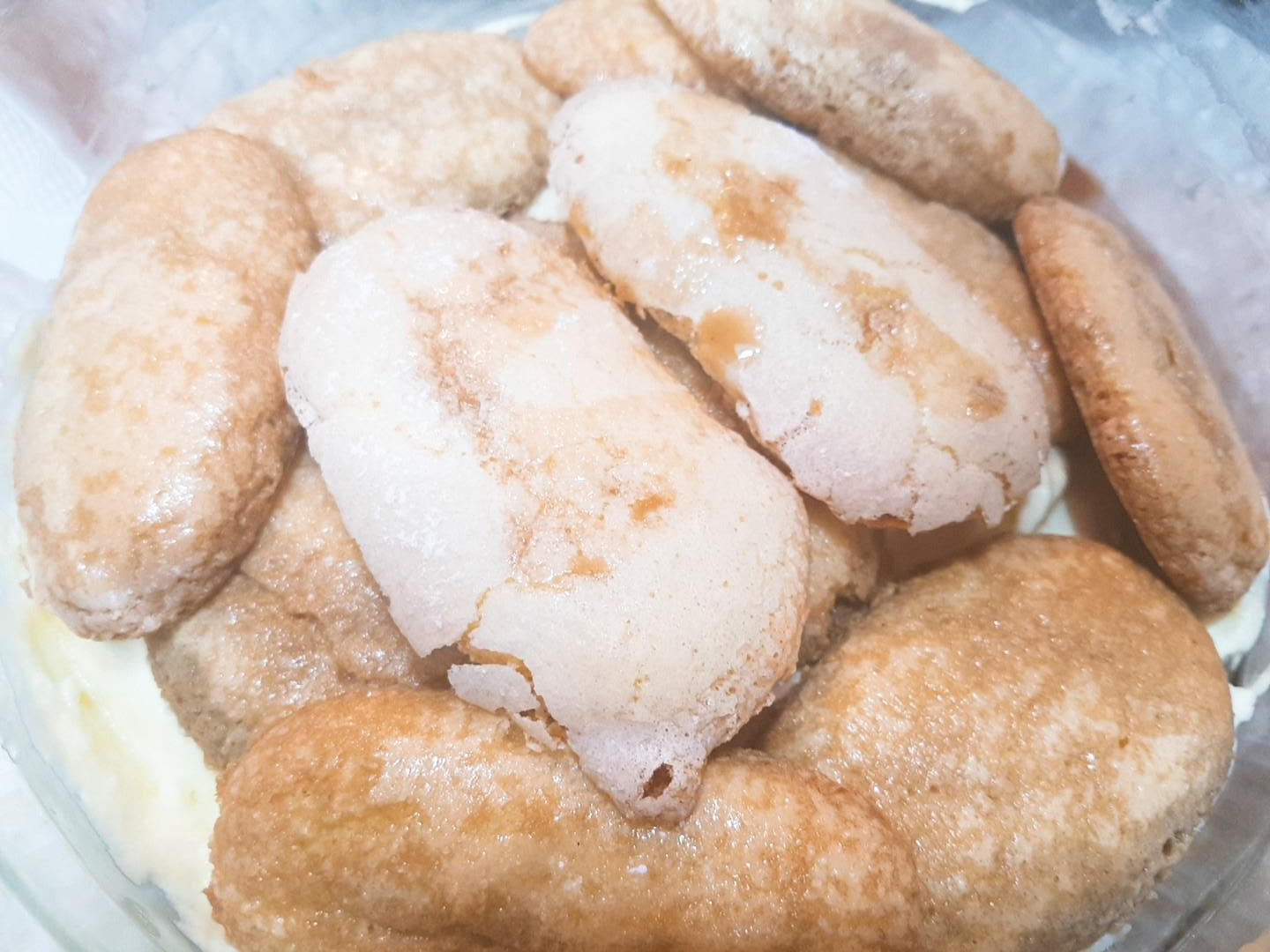 7. 머랭을 치즈혼합물에 넣고 섞은 후, 커피에 레이디핑거 쿠키를 적셔 틀에 넣고 크림을 붓는다.