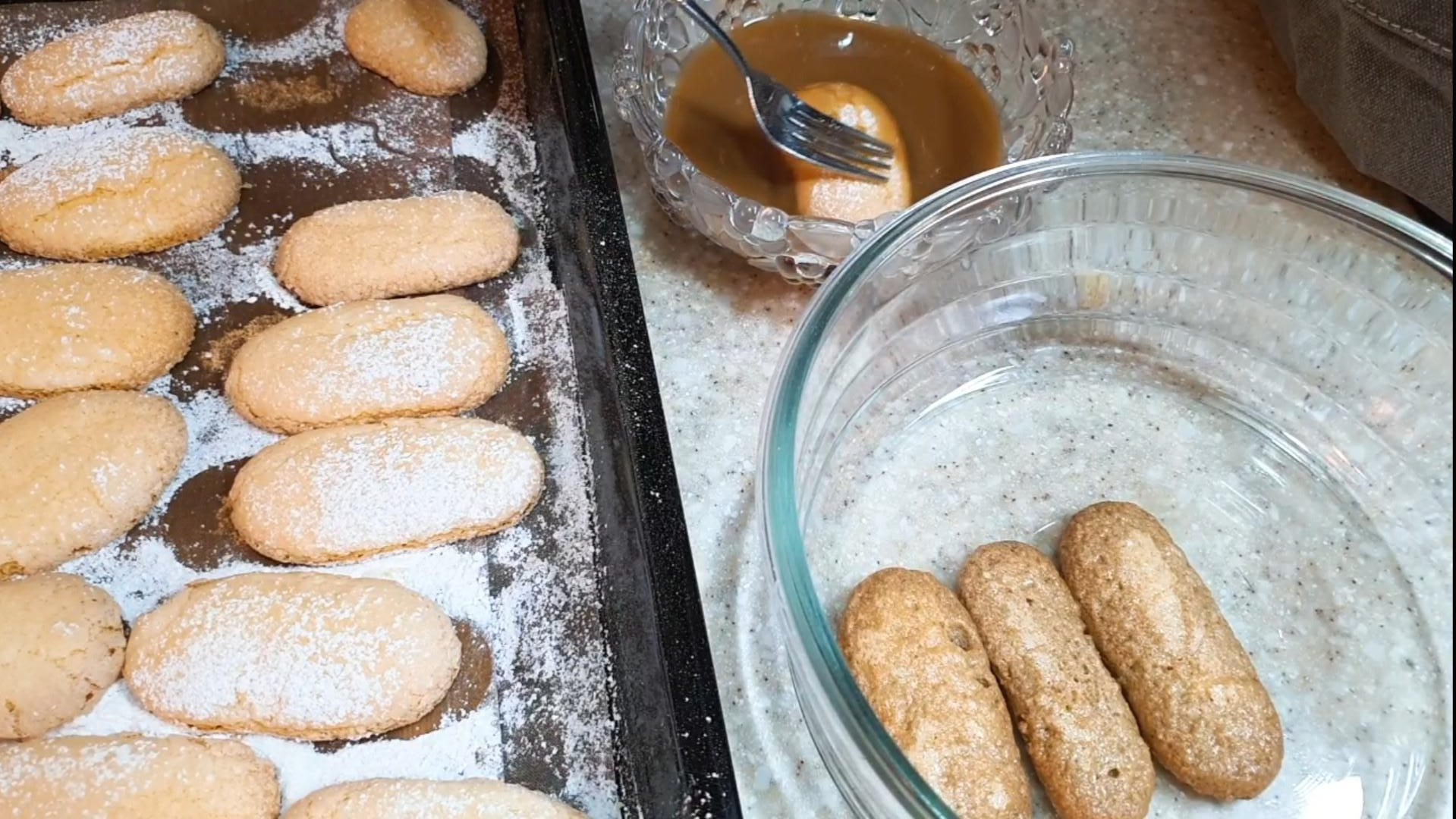 냉장실에서 꺼낸 커피물에 레이디핑거 쿠키를 충분히 적셔서 밑에 깔아준 후