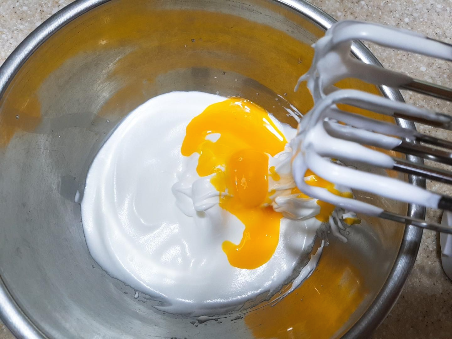 머랭뿔이 독수리부리 모양처럼 올라오면 달걀노른자2개와 바닐라익스트랙을 살짝 넣어주고 거품기로 골고루 섞어주세요.