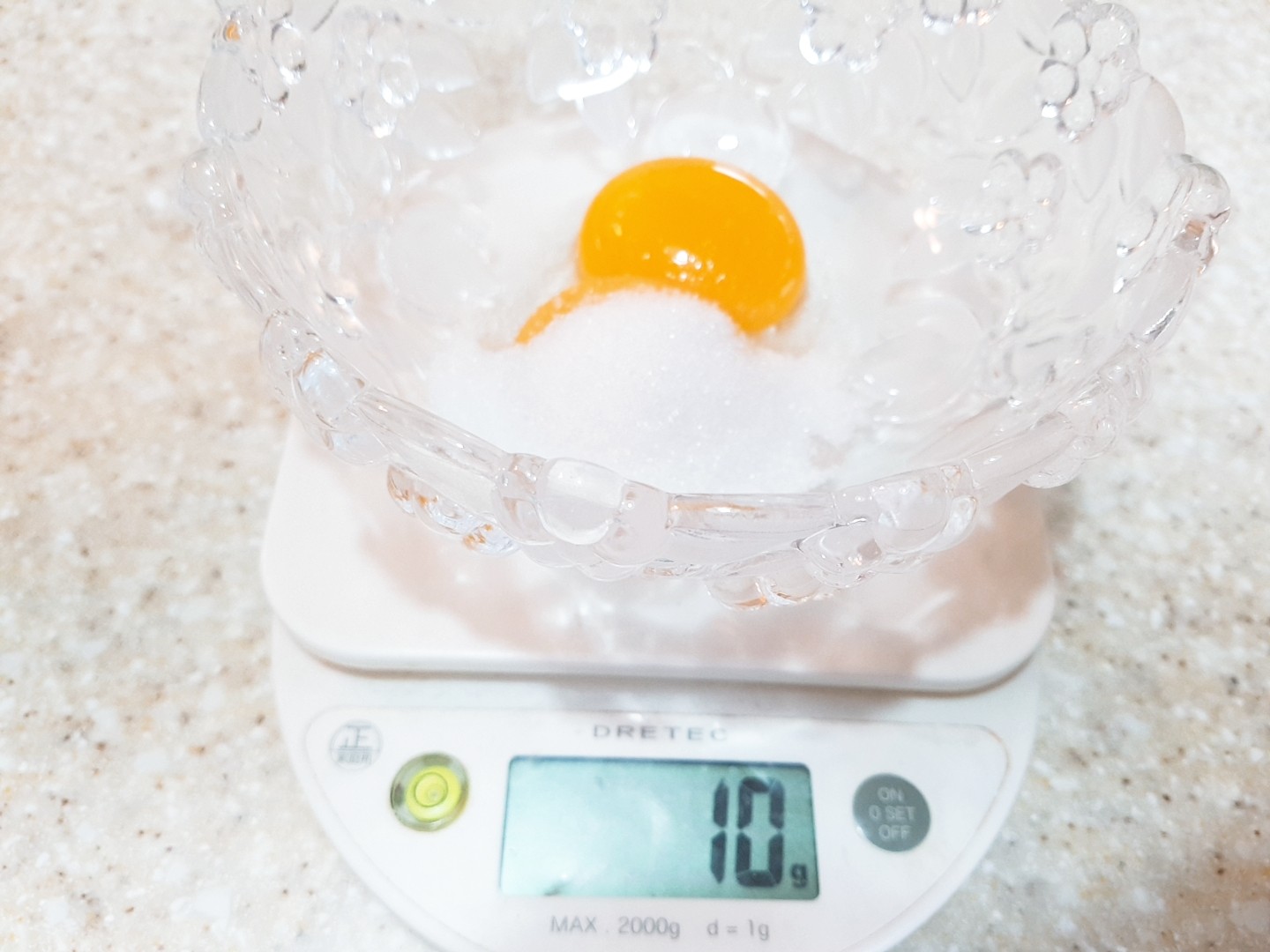 노른자2개와 설탕10g을 준비하고