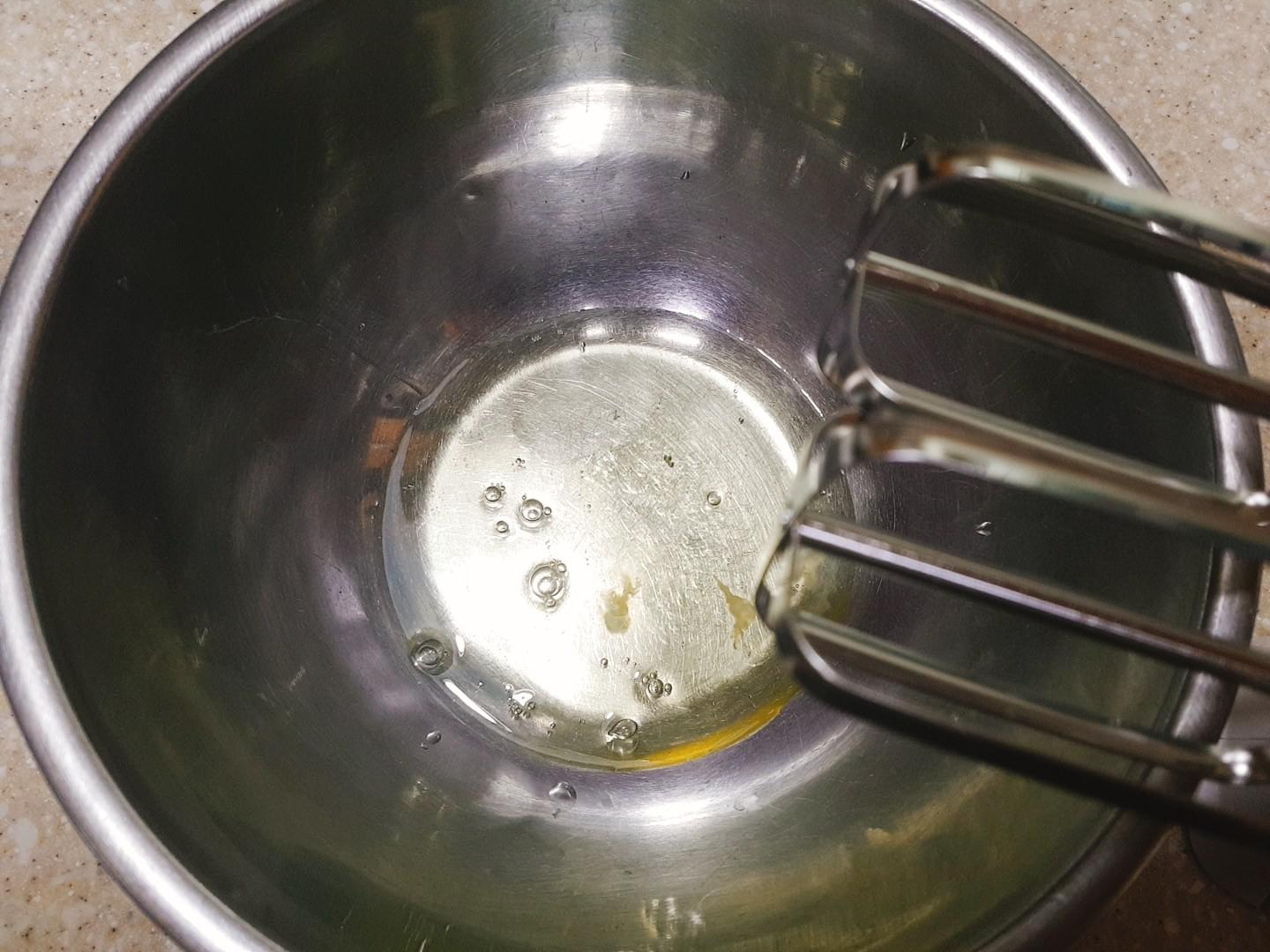 1. 달걀흰자를 휘핑하다가 큰거품이 올라오면 설탕을 나눠 넣고 휘핑해 머랭을 만들고 노른자와 바닐라익스트랙을 넣고 골고루 섞이도록 휘핑한다.