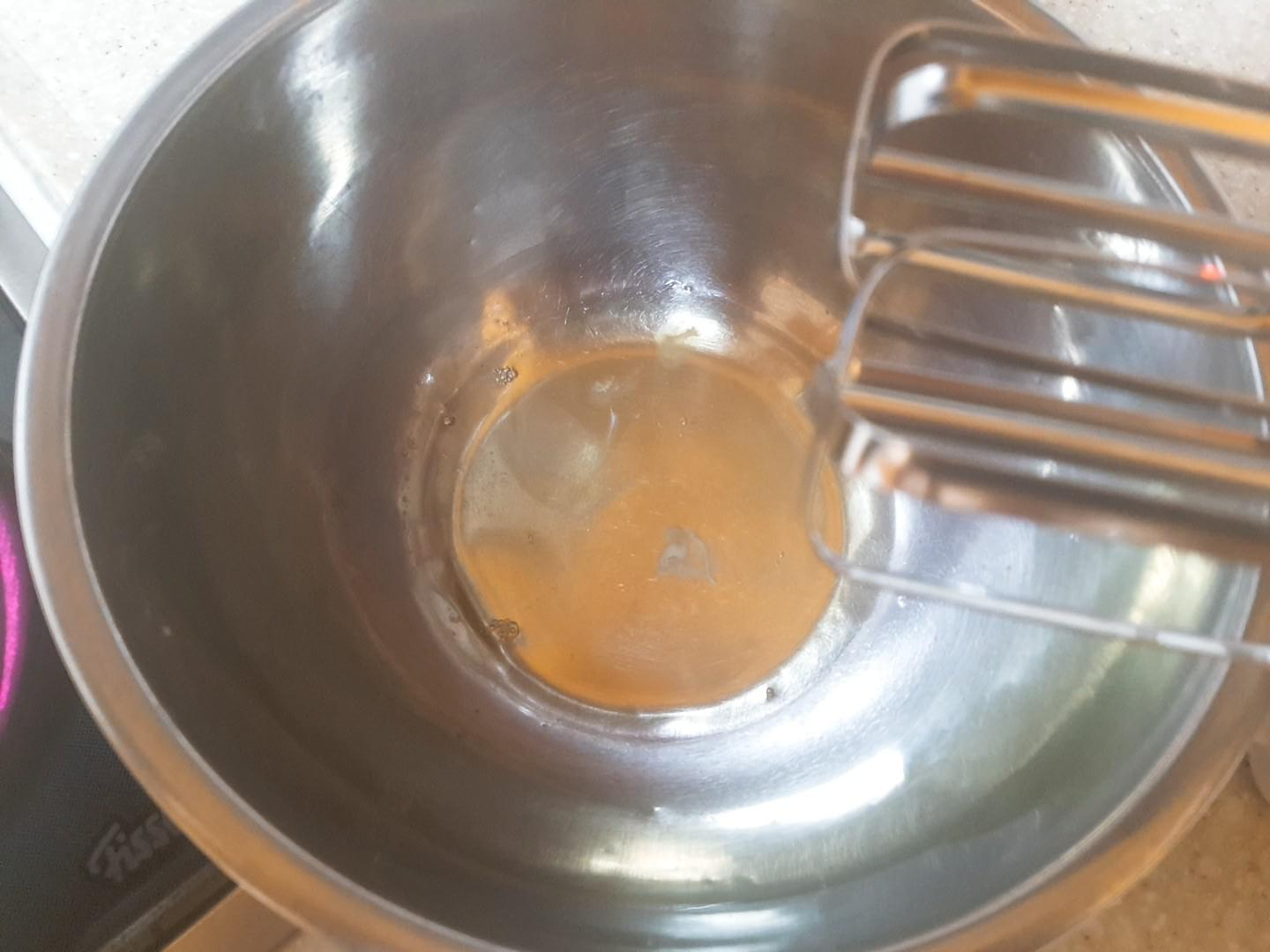 6. 설탕과 물을 냄비에 넣고 끓이는 동시에 달걀흰자를 휘핑하다가 설탕이 끓으면(118℃) 달걀흰자에 넣고 휘핑해 뿔이서는 머랭을 만들어주세요.