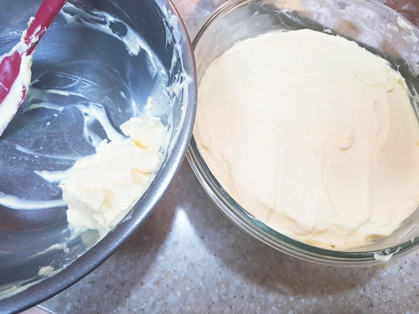 머랭에 ⑤치즈혼합물과 같이 섞어 티라미수 크림을 만들어주세요.