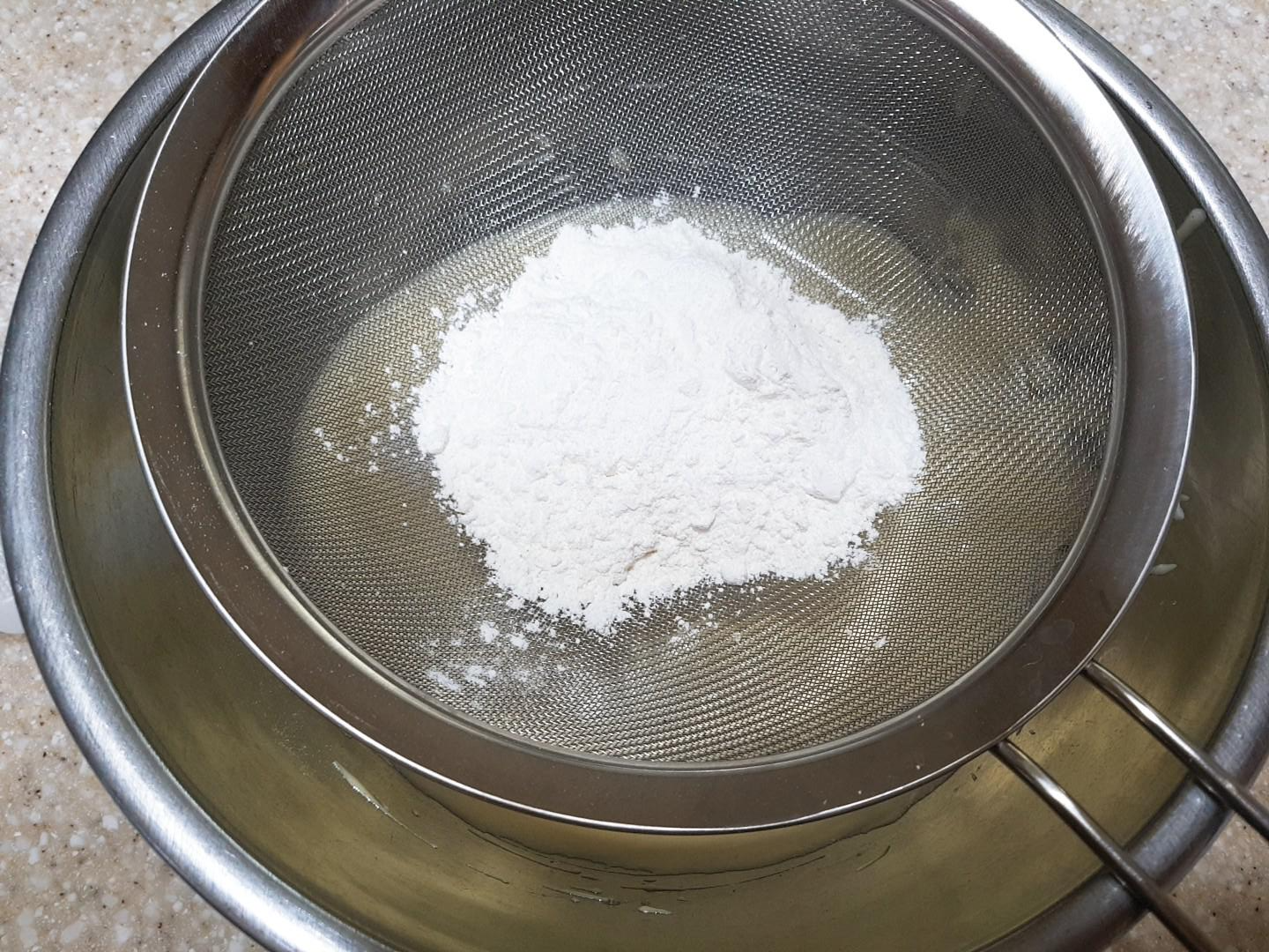 ①머랭위에 체 쳐 넣어 주세요.