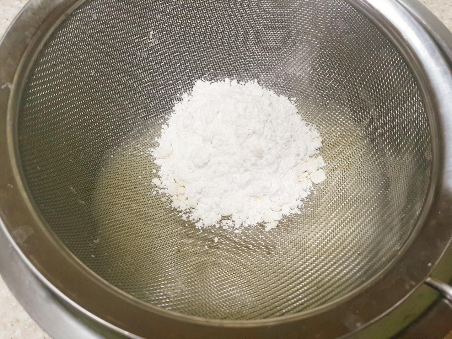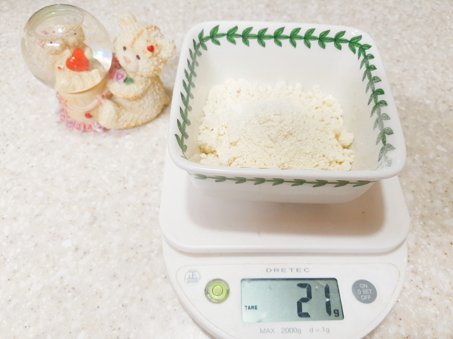 그릇 안에 박력분(10g), 슈가파우더(10g), 아몬드가루(20g)을 다 같이 넣어준비해주세요.