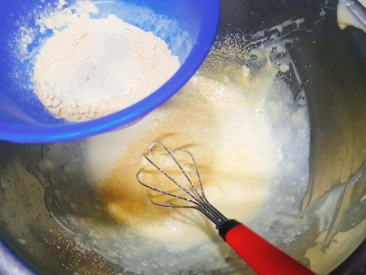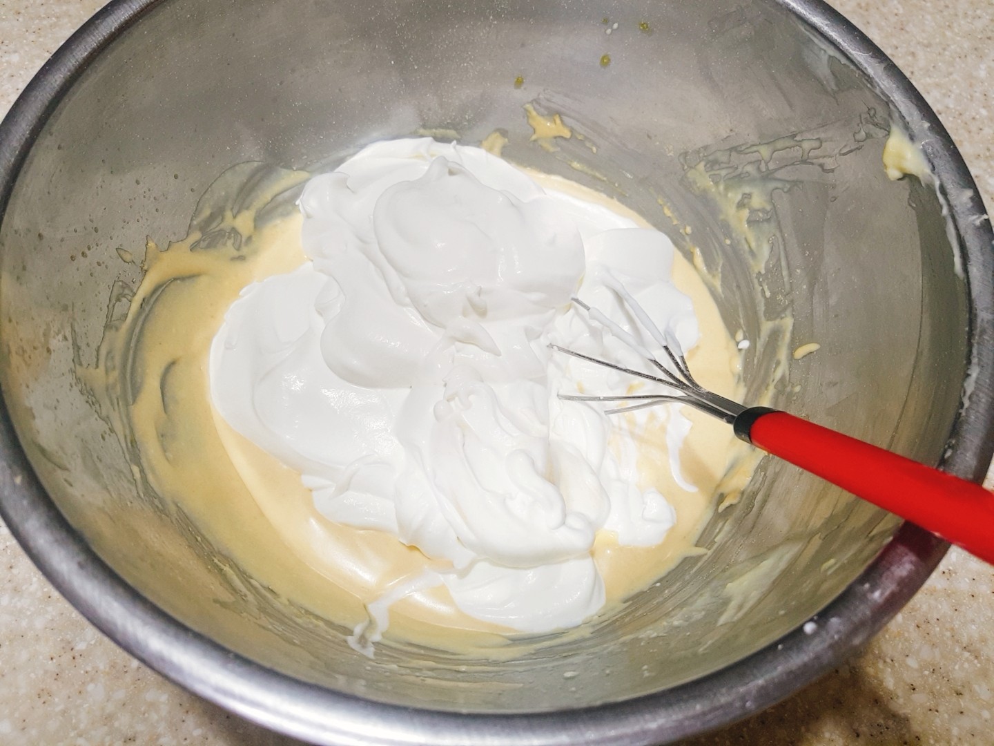 2. 비스퀴를 만들어 볼게요. 머랭을 쳐 준 후 달걀 노른자를 섞고 가루류들을 체 쳐 넣은 후, 식물성 오일과 바닐라 익스트랙을 넣어 섞어주면 완성입니다.