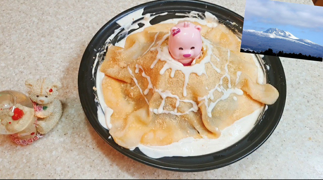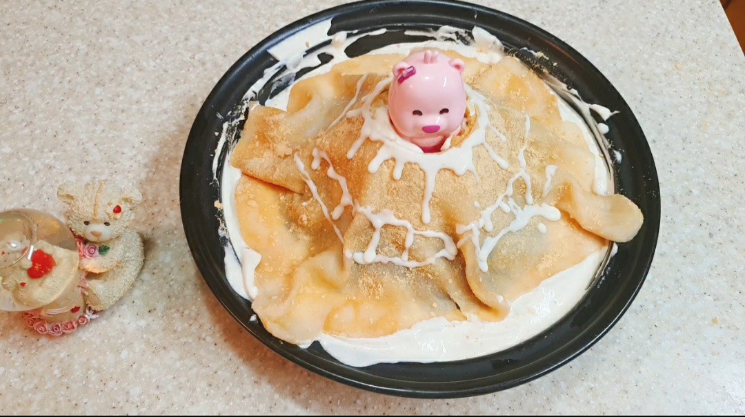 밀어준 인절미 떡을 위에 얹어 줍니다. 떡인데 완전 감쪽같지 않나여?ㅎㅎㅎ
