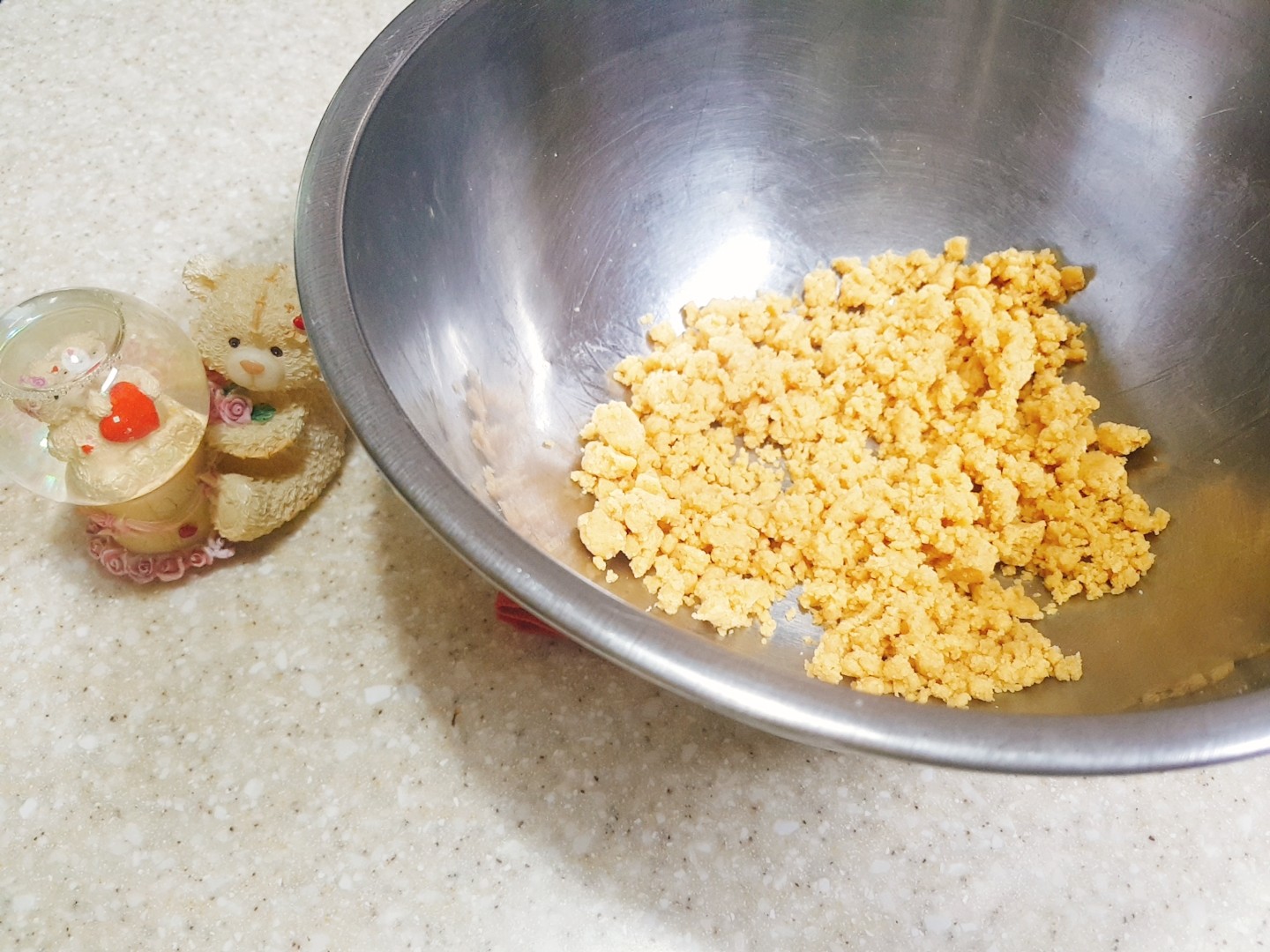 재료를 다 넣고 손으로 뭉쳐주면 이렇게 콩가루 크럼블 완성이에요!! 이 상태에서 냉장고에 잠시 넣어주세요~