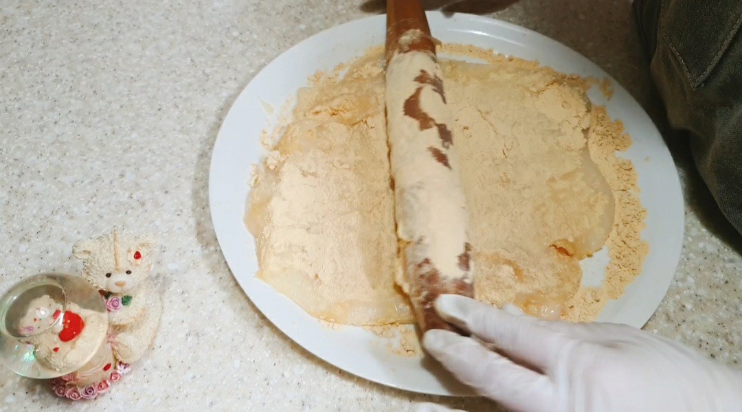 7. 이제 찹쌀반죽을 만들어줄게요. 그냥 인절미떡 얇게 밀어주면 됩니다.