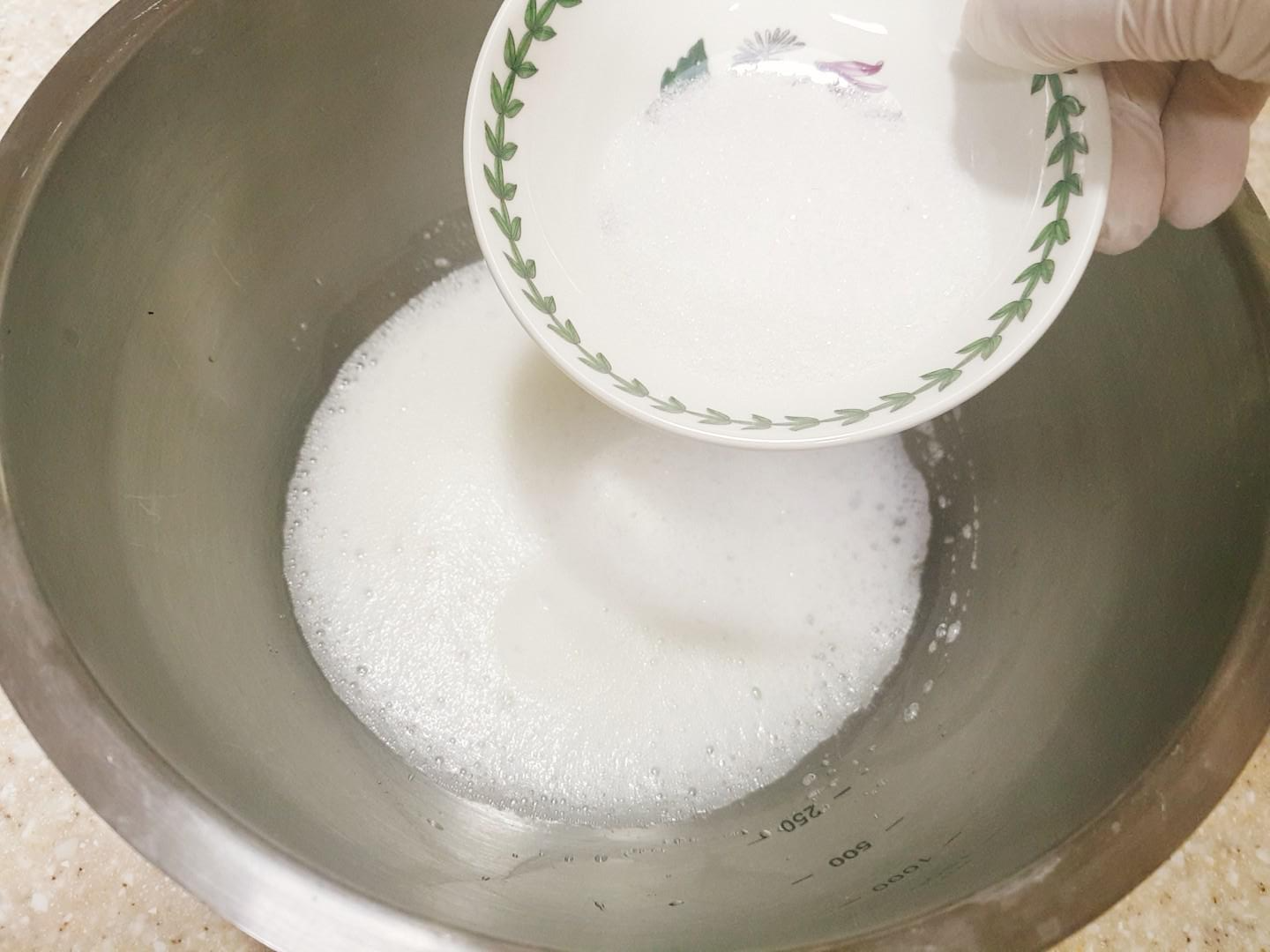 거품이 맥주거품처럼 올라오면 설탕 25g을 2-3번 나눠서 넣어주세요 설탕넣고 녹으면 설탕 또 넣고 하면 되요.