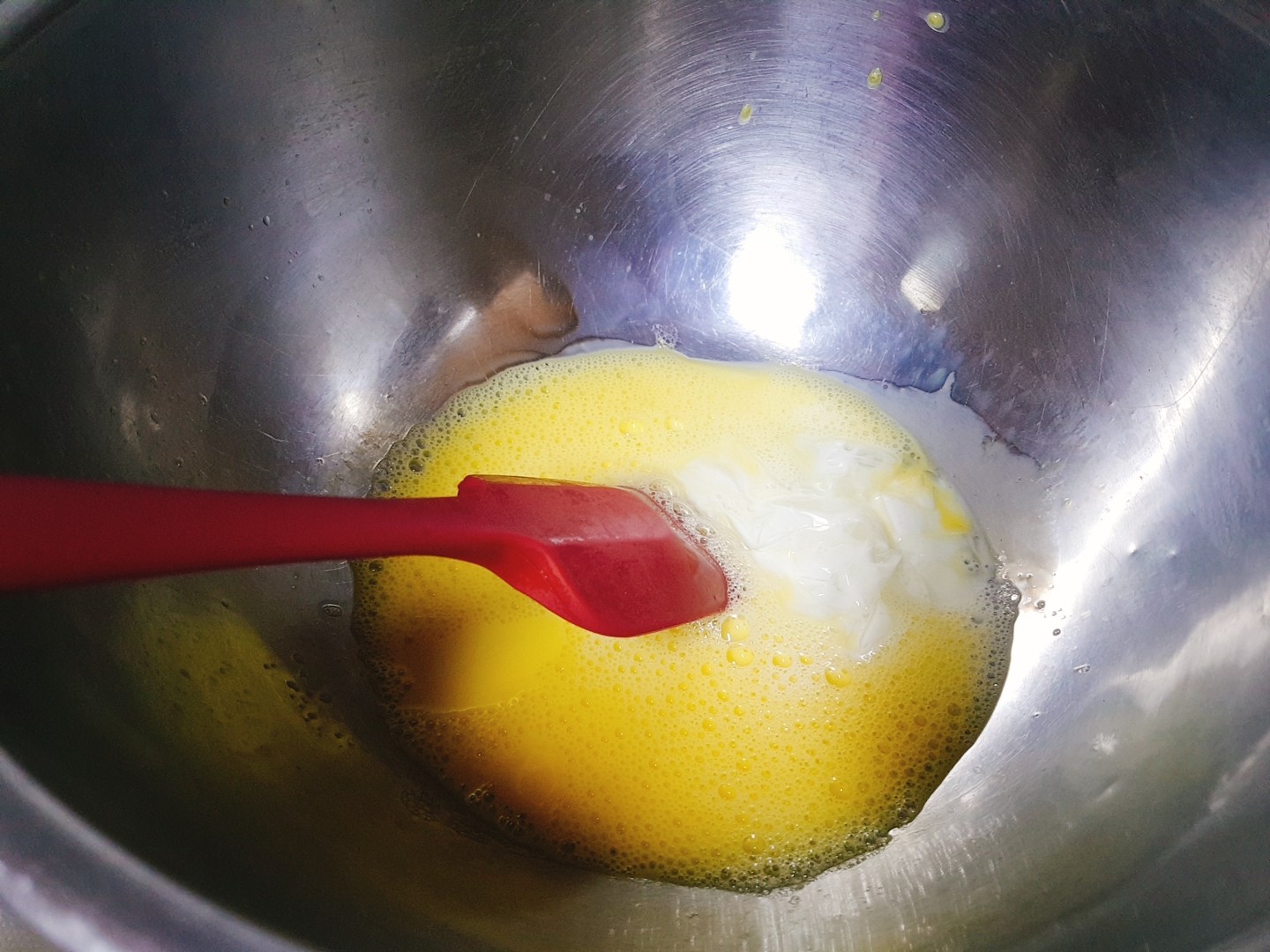 노른자 1개를 넣고 거품기로 잘 섞어주고~