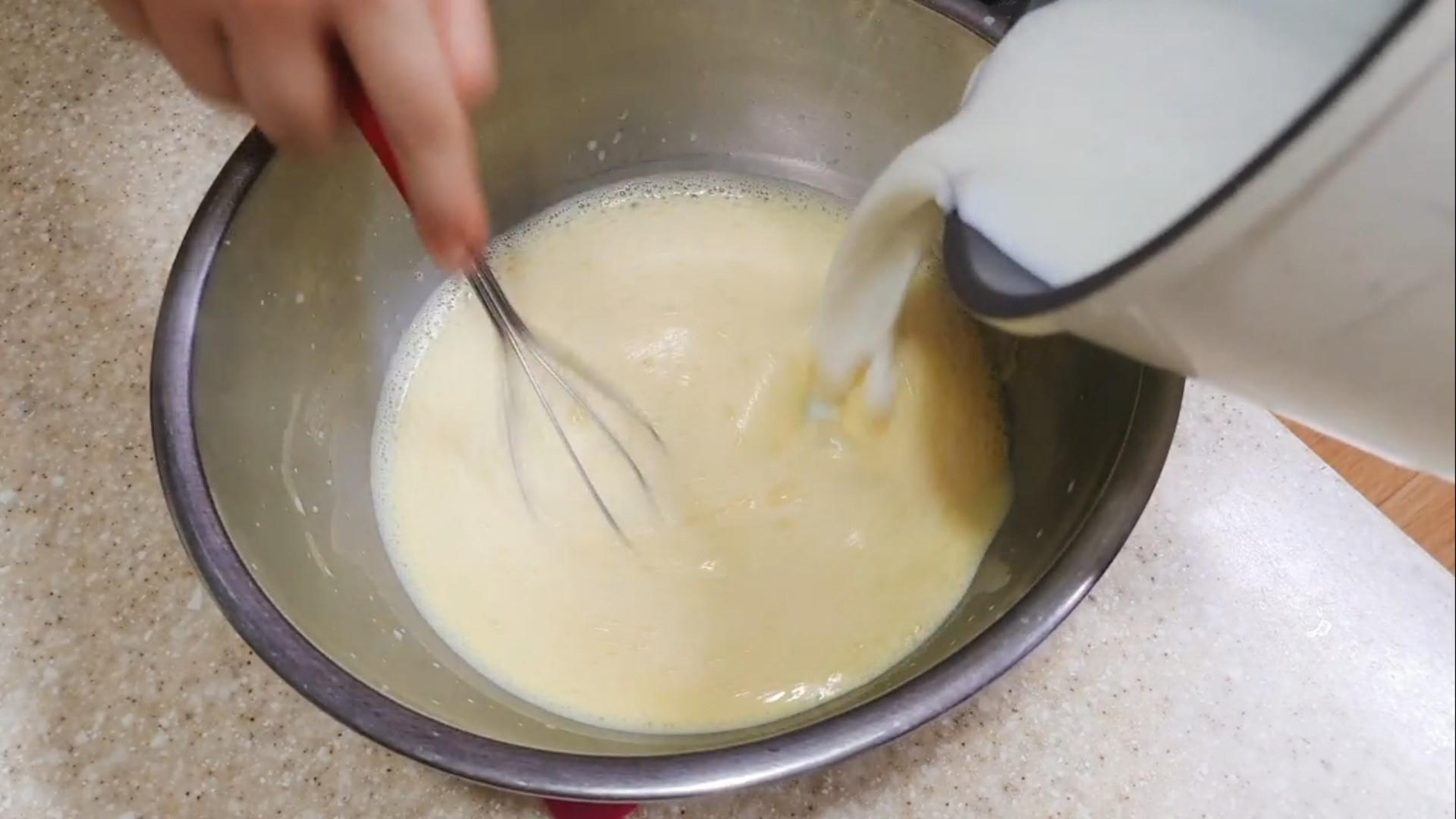 다 섞었으면 노른자가 익지 않도록 빠르게 거품기를 저어가며 뜨거운 우유를 넣어 같이 섞어주세요.