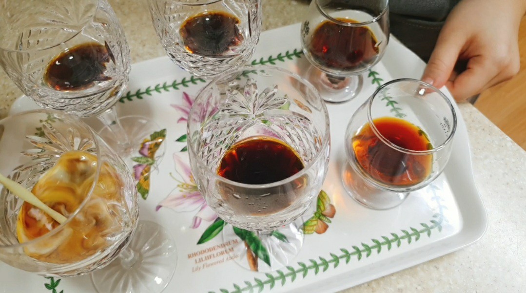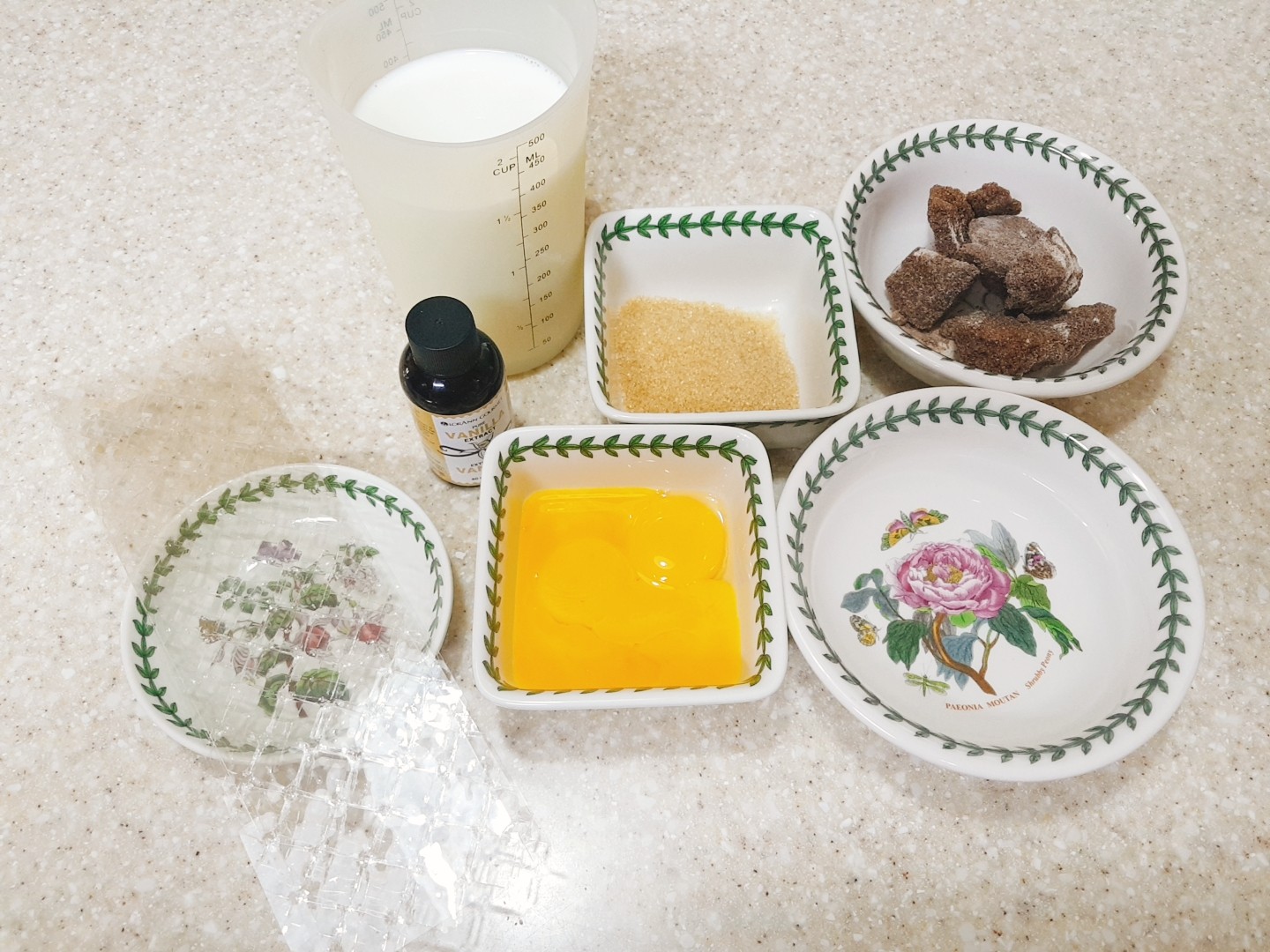 재료: 흑설탕(100g), 물(100g), 달걀노른자(4개), 설탕(60g), 바닐라익스트랙(5g), 뜨거운 우유(80℃=600g), 판젤라틴(10g)