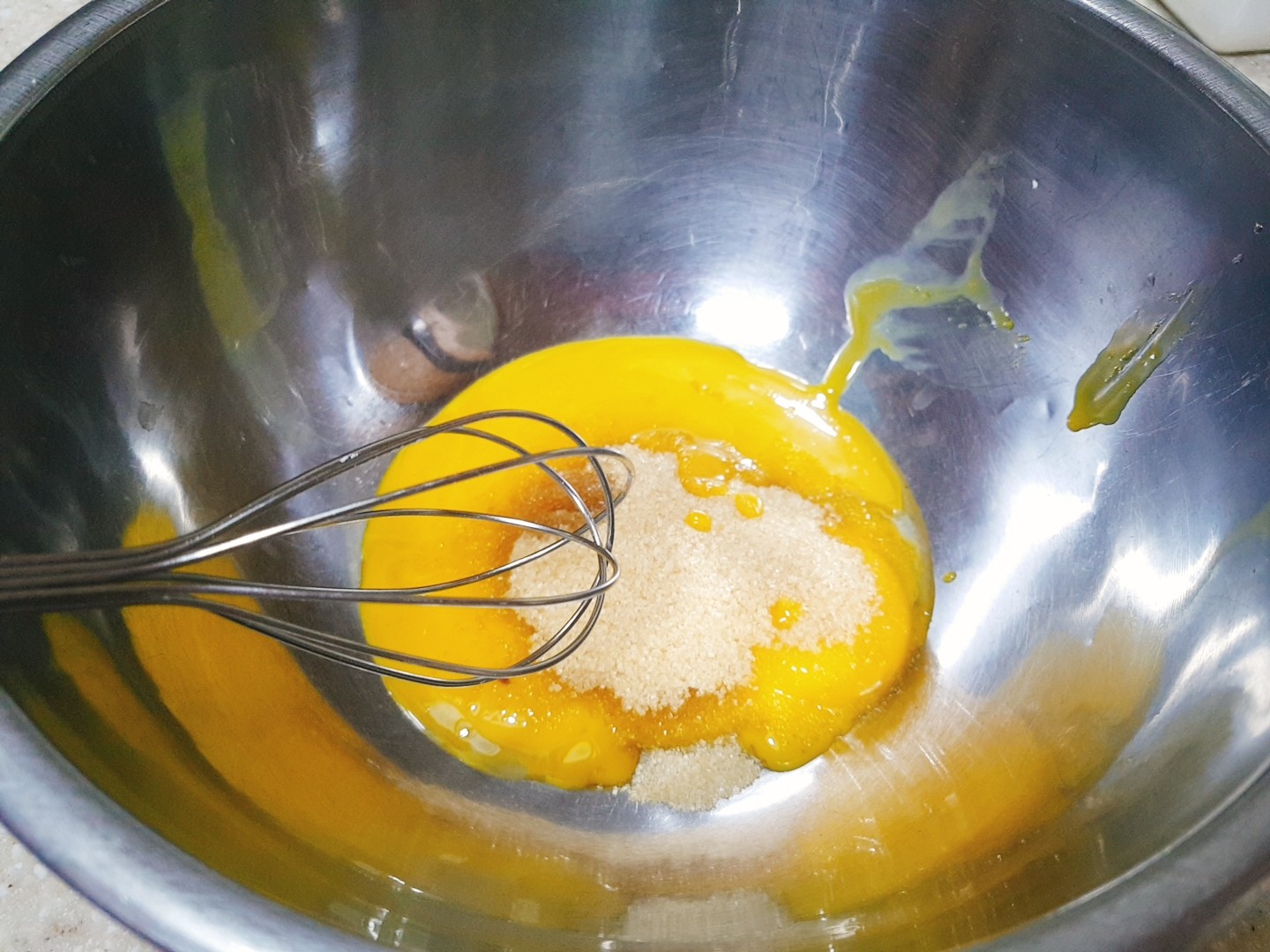 달걀노른자 4개랑, 설탕40g, 바닐라익스트랙 5g 정도를 넣고 설탕이 녹을 정도로 거품기로 잘 섞어주세요~ (설탕은 많이 먹으면 안좋으니 기존 양보다 항상 좀 작게 넣어줍니다~ 설탕소스로 충분히 달기 때문에 푸딩까지 안달아도 되용^___^)