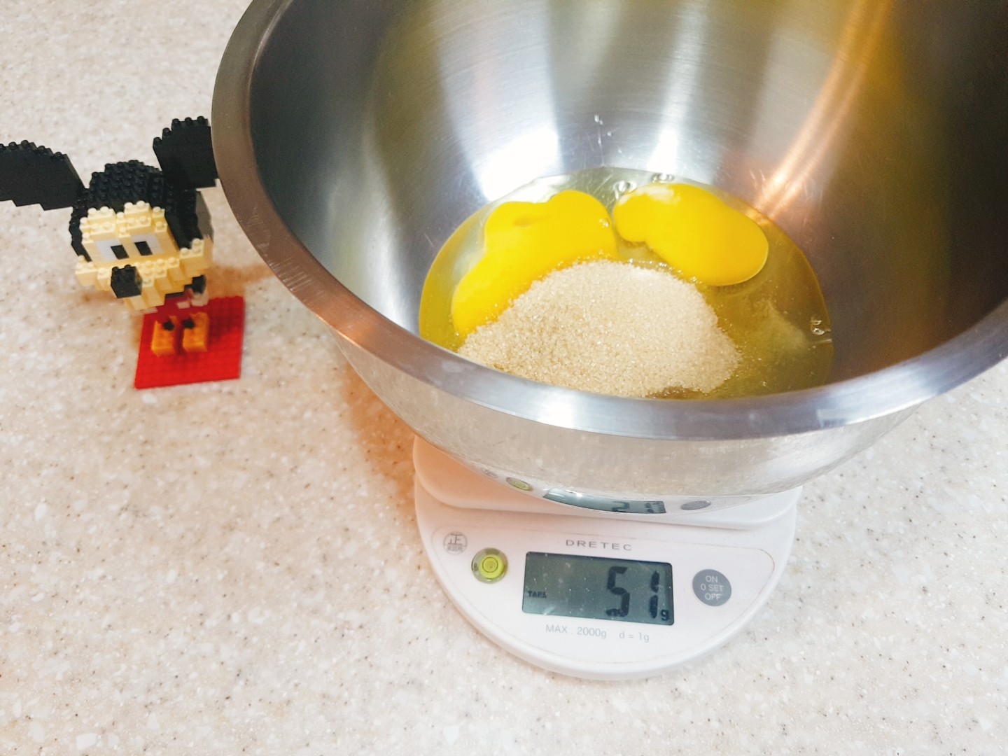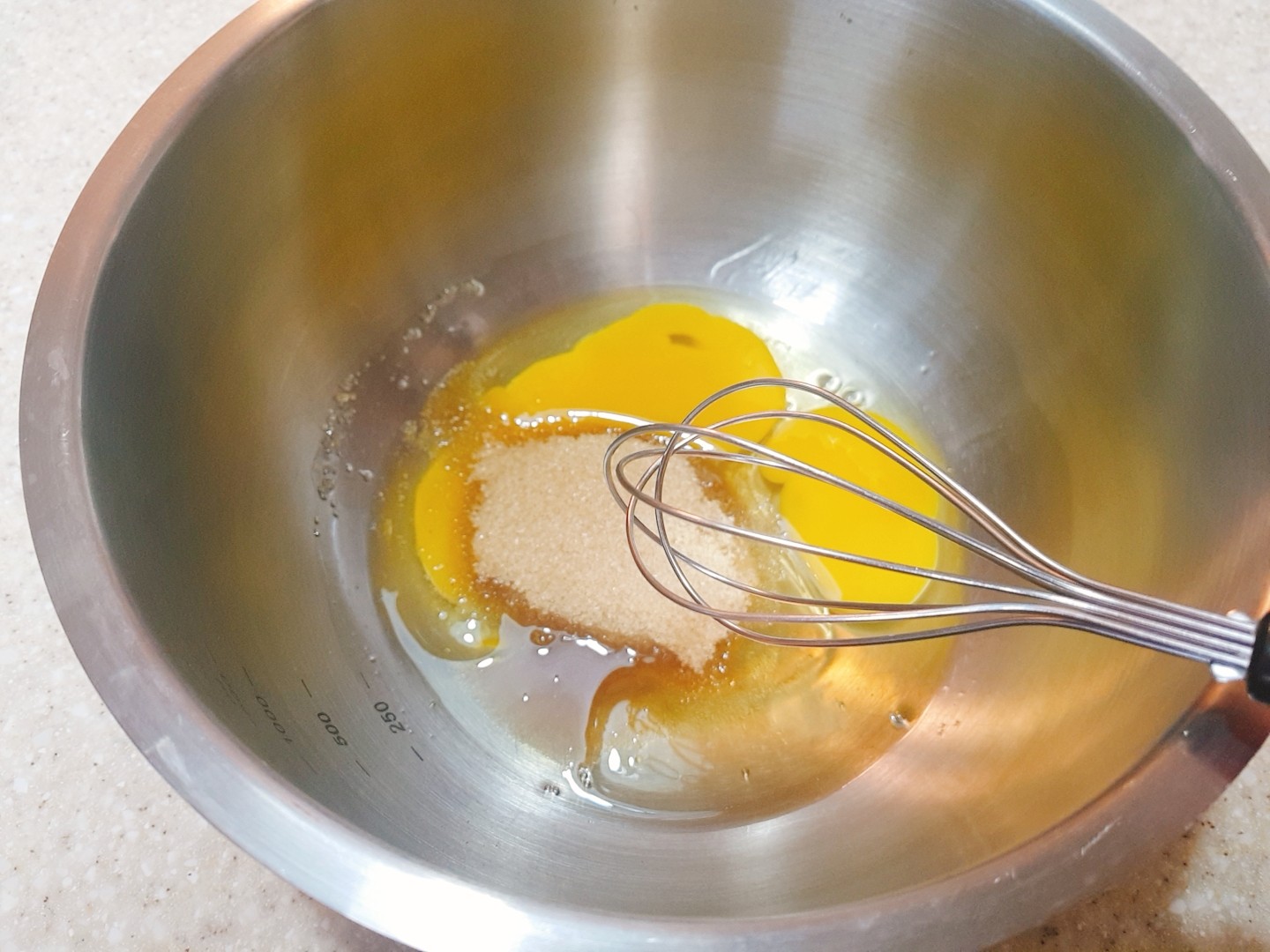 계란 104g정도가 필요한데 작은 계란은 하나에 약30g 인데 큰 계란은 하나에 약 57g 정도 하더라구용~ 큰 계란 2알 풀어주고, 설탕 50g을 넣어주세요.