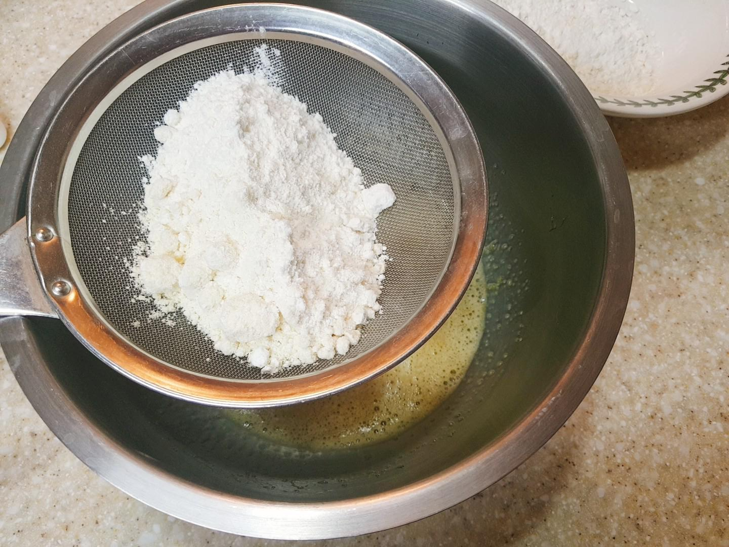 박력분(76g), 아몬드 가루(50g), 베이킹 파우더(3g)을 체 쳐 주세요.