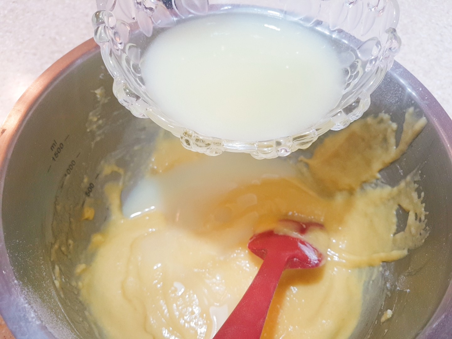 녹인 버터를 2-3번 정도 나눠 섞어주세요.