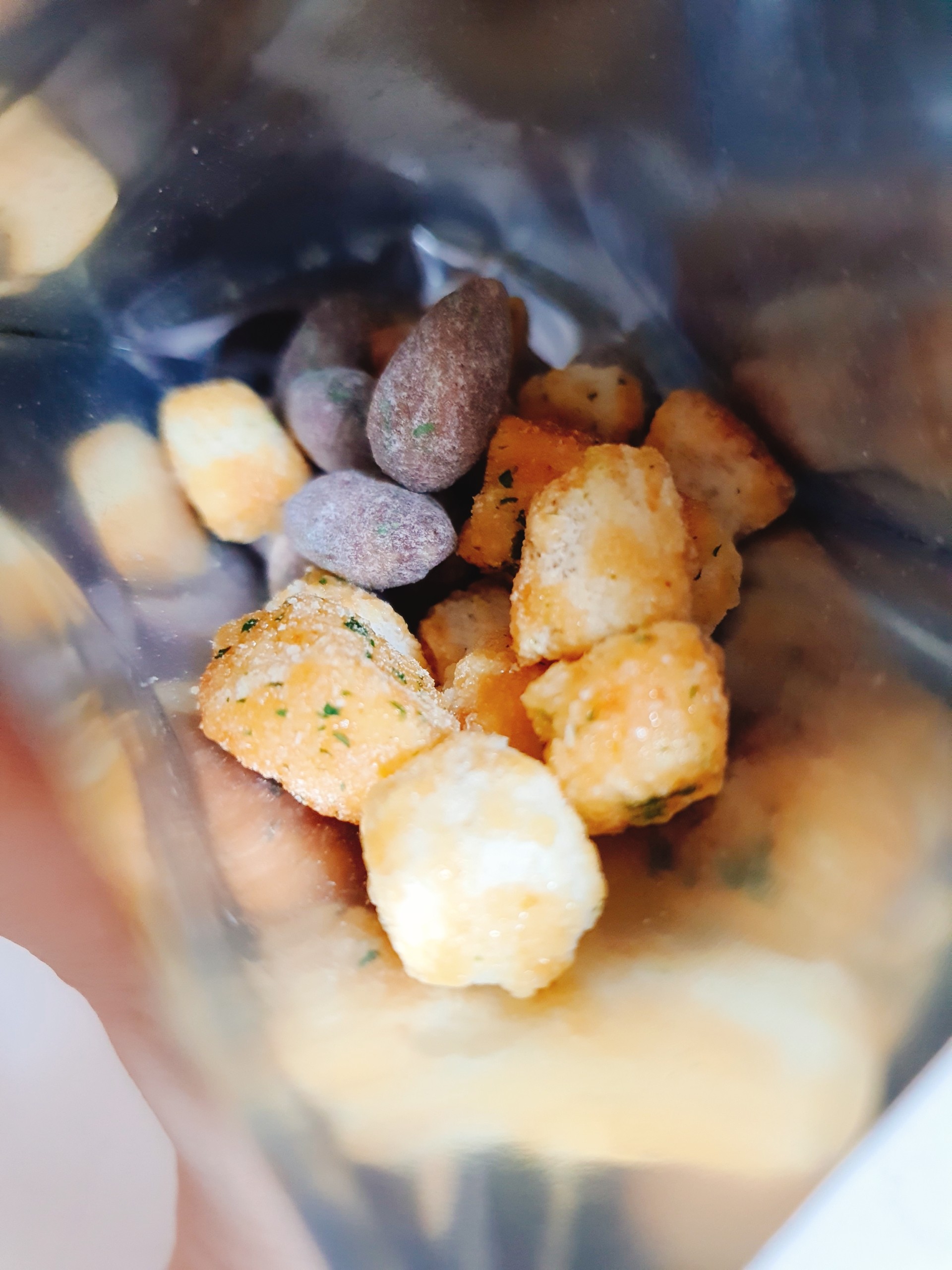 안에 모습이에요~ 이건 따로 아몬드맛 초콜릿에 쌓여있는게 아니라 아몬드에 마늘빵 씨즈닝 가루를 뭍히고 마늘빵을 넣어놨어요~!!