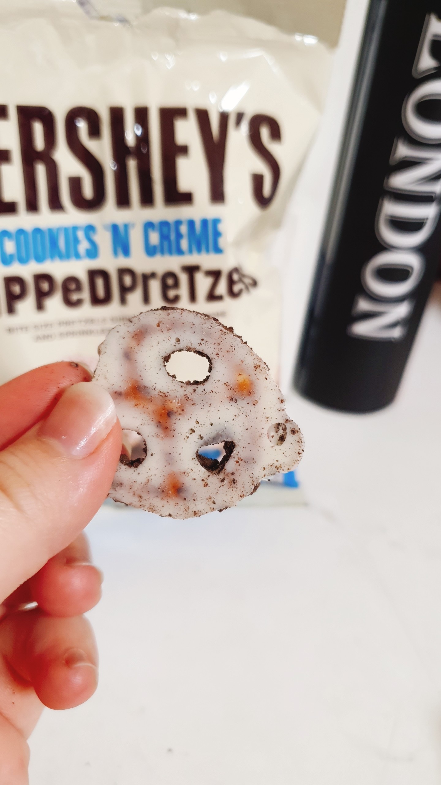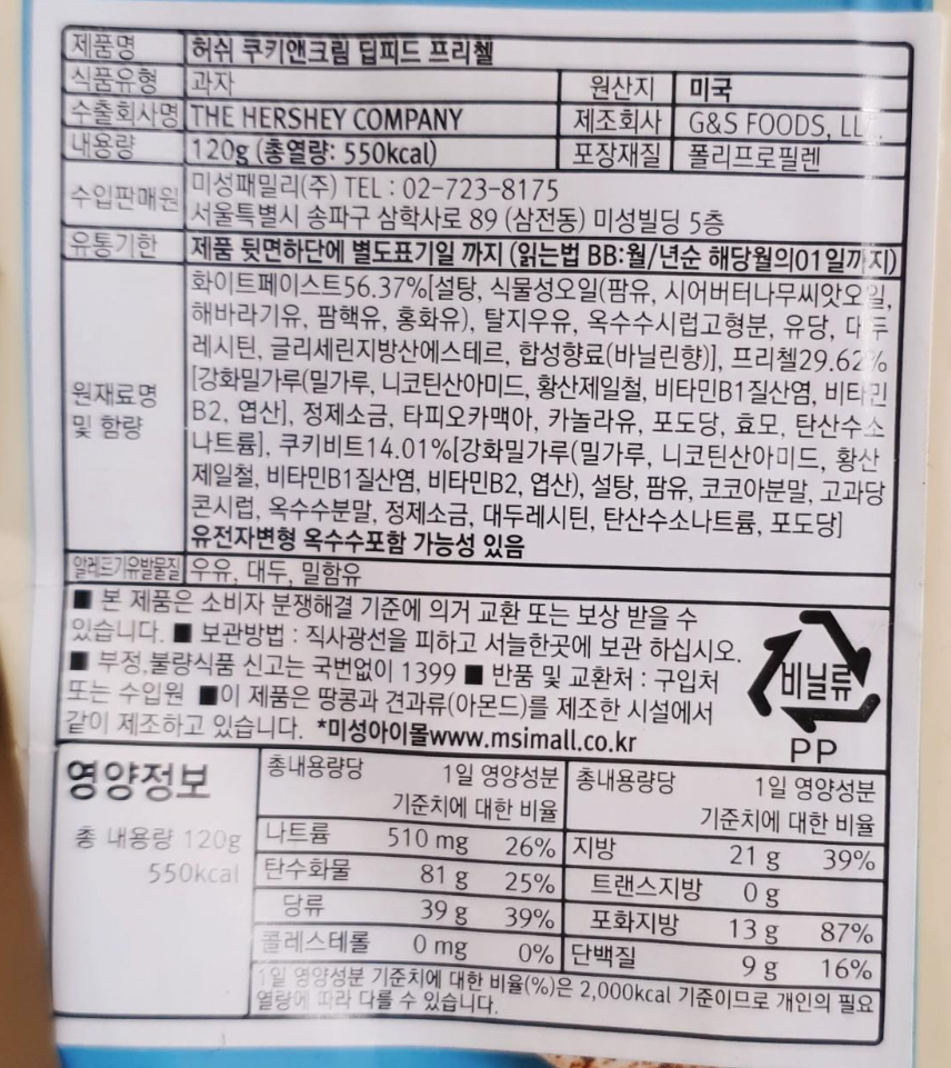 근데 또 진한 초코맛이 부담스러워서 일부러 과자가 들어있는 초콜릿을 좋아하시는 분도 계시니까 나쁘진 않아요 하지만 허쉬초콜릿을 생각하고 사셨다간 큰 코 다칩니다ㅋㅋㅋ 정말로 쿠키앤크림맛이 하나도...안나니까요^^ 내가 느낀건 담백한 프레첼 뿐....